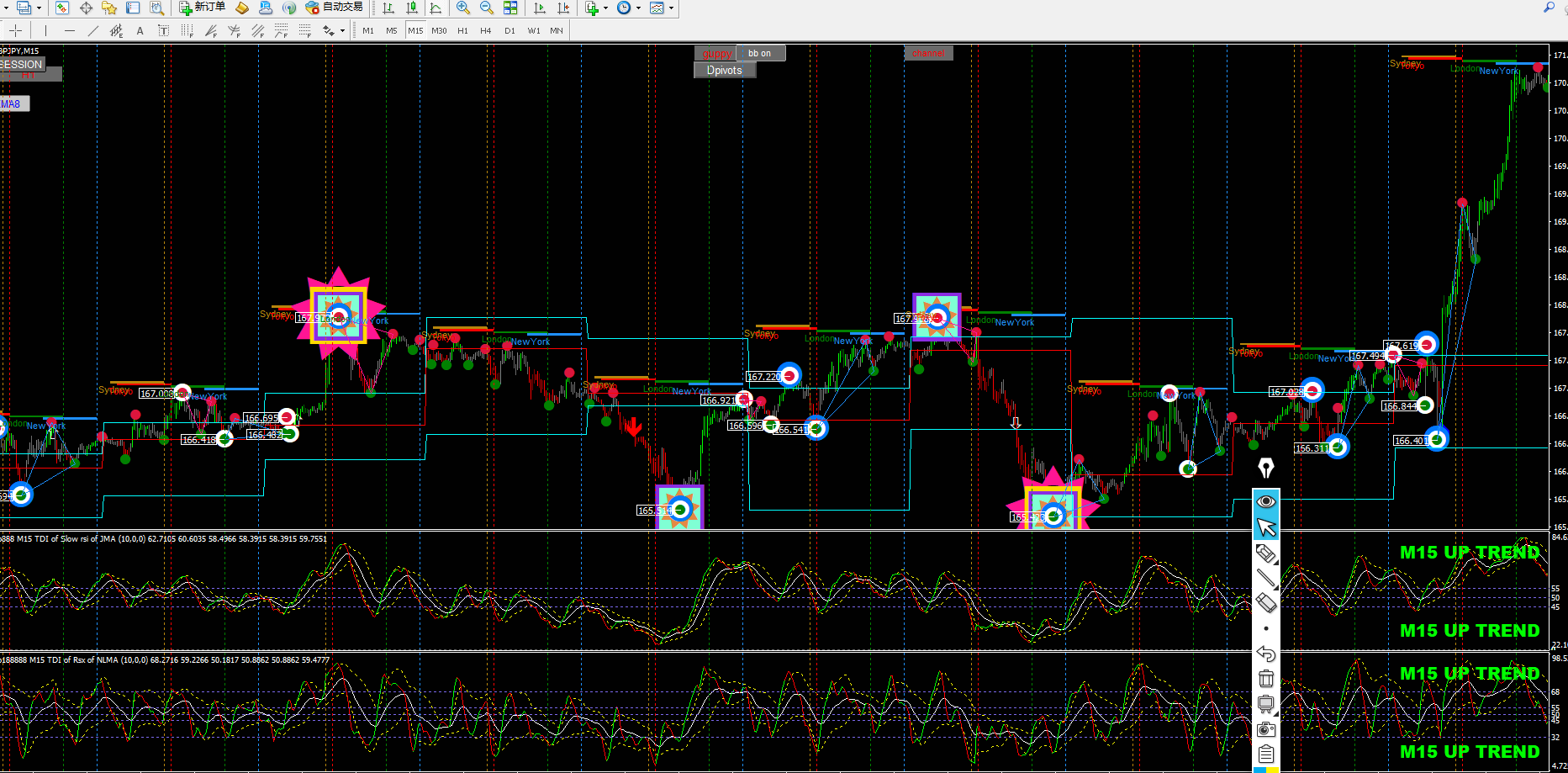 It's a very interesting indicator i found somewhere on the internet. At the open of each new candle, he plots a point trying to forecast the direction of the candle.