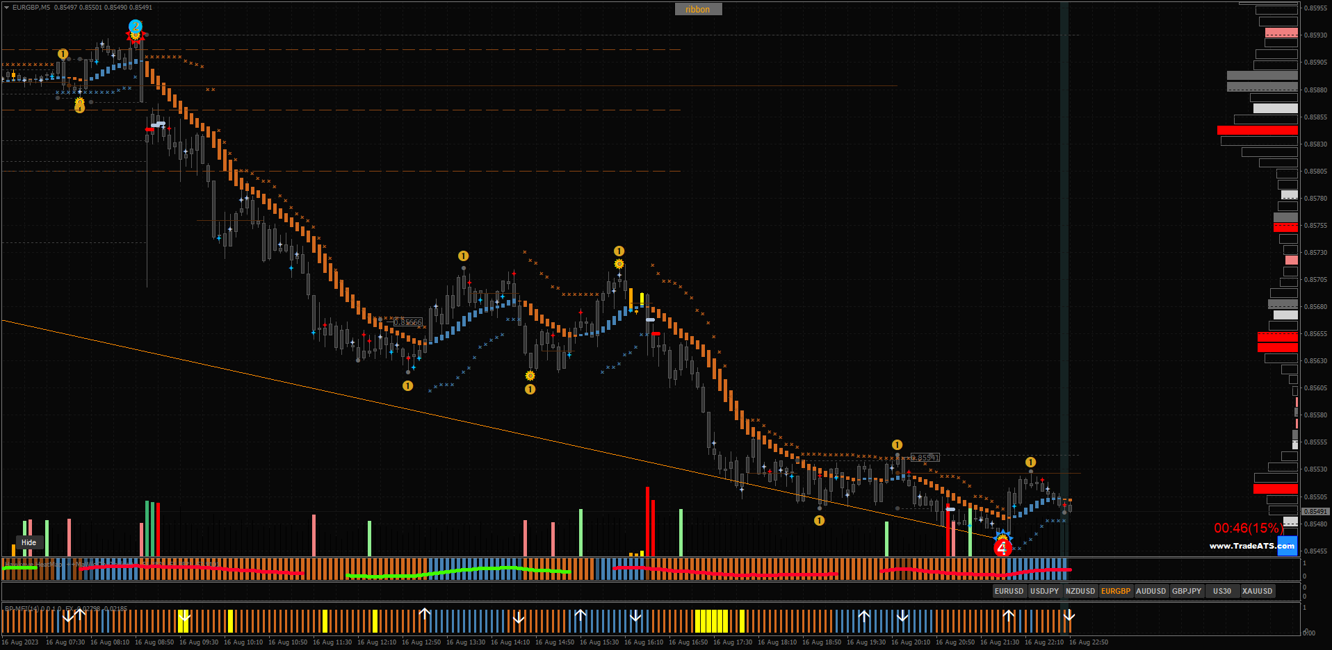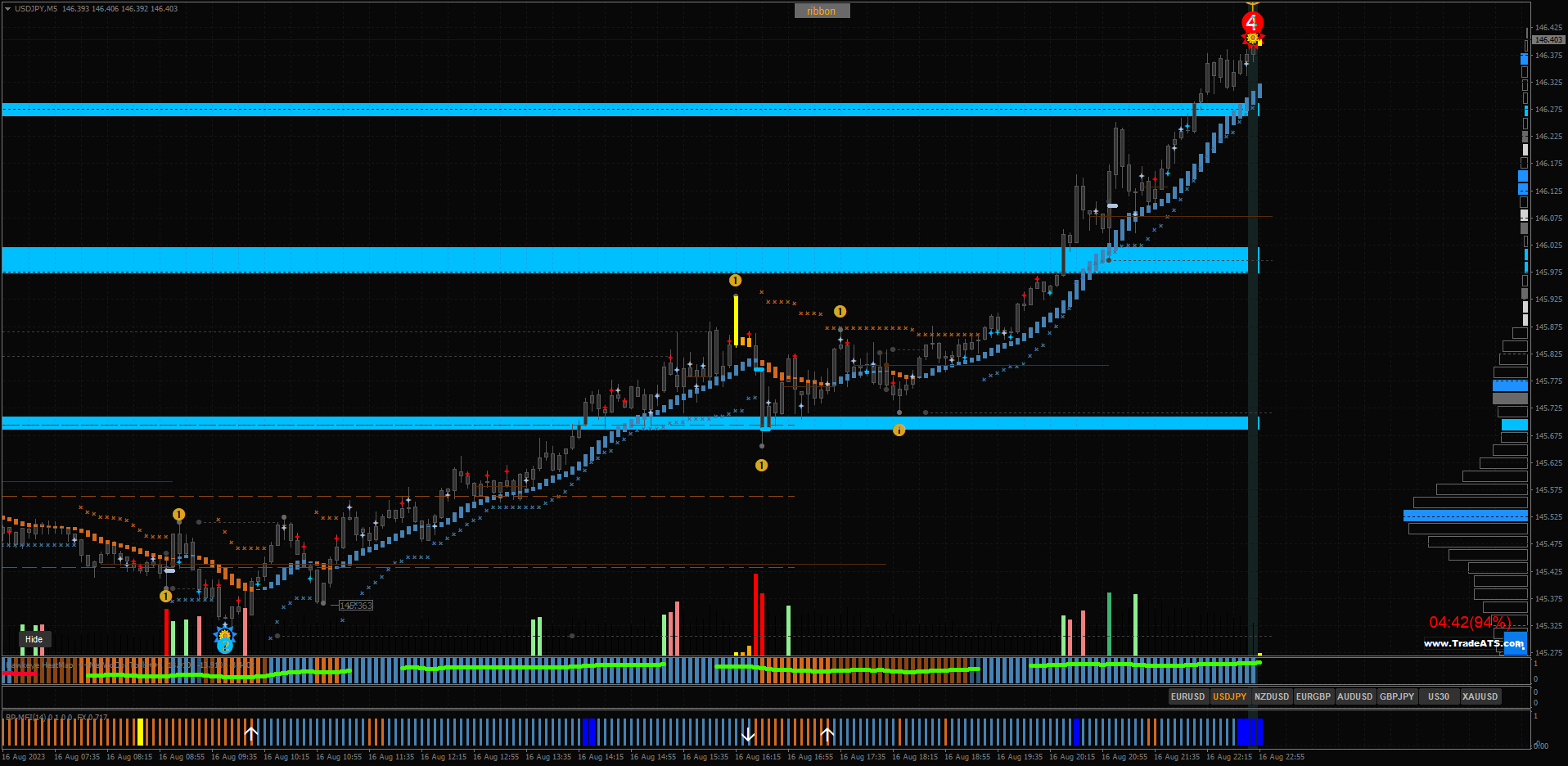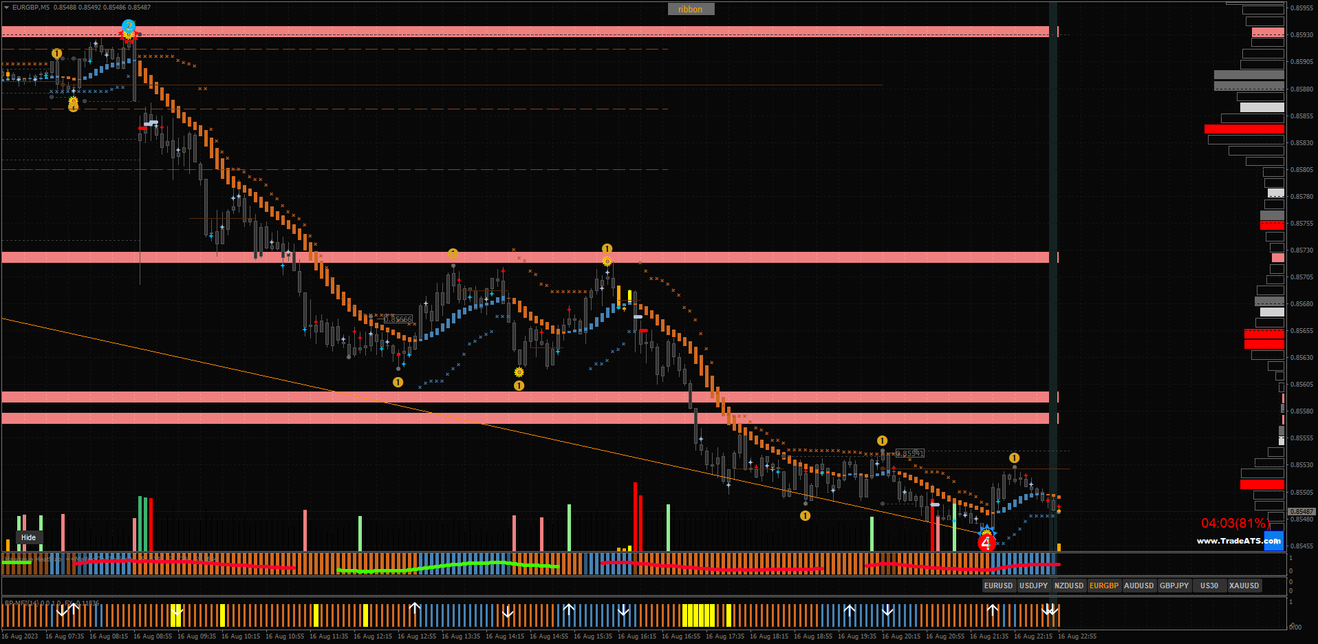 The Road_Map_v04 indicator shows series of waves, breakout points and profit targets.