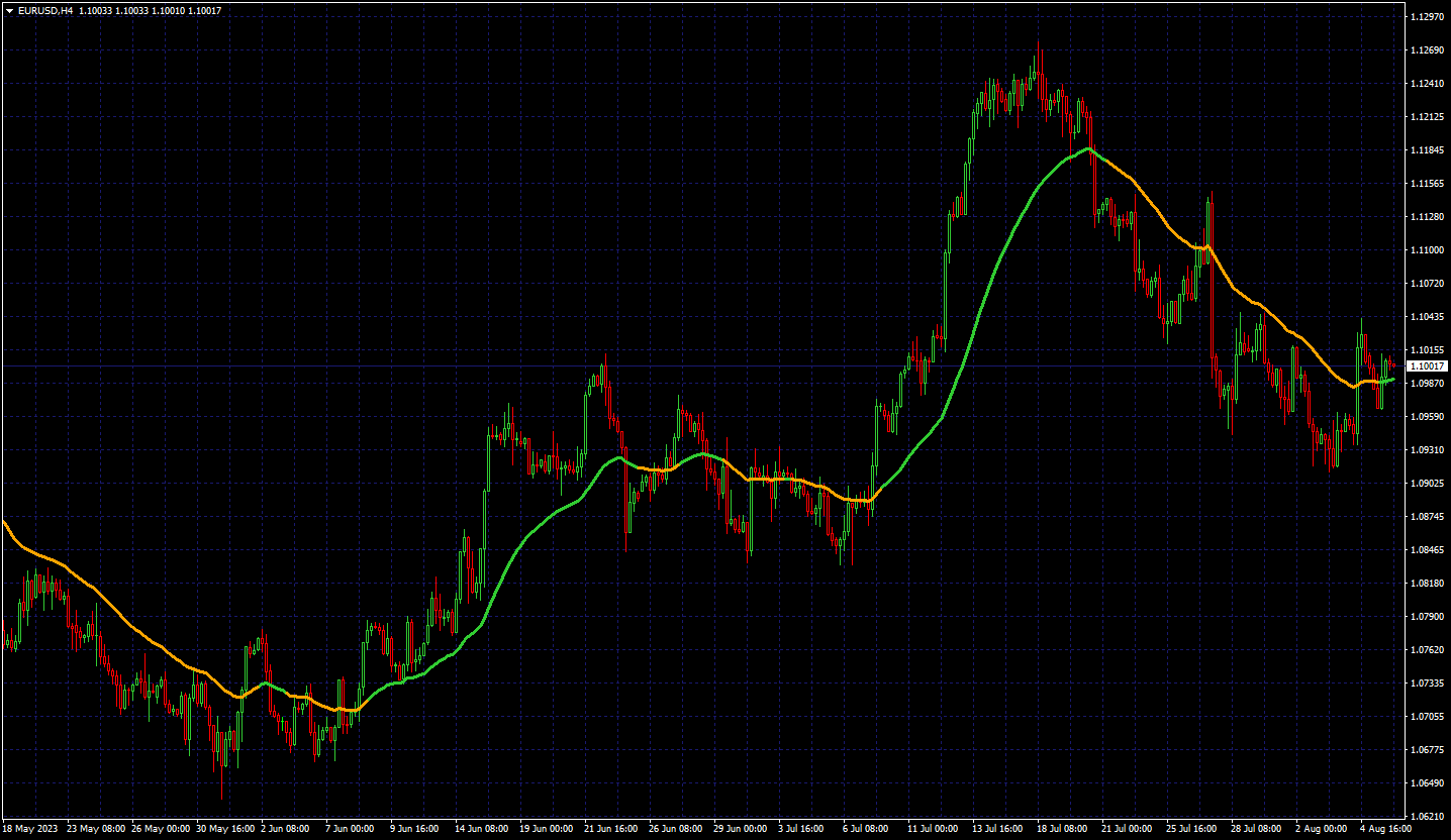 EMA (Exponential Moving Average) can use fractional period for calculation (ie: it can use, for example, period 14.5 and not just period 14 or 15) and that makes it suitable for adapting. So, this is a EMA that is using RSI to adapt itself to the market. Parameters are all the usual : rsi period and price to be used in calculation. Usage is similar to any average usage, with an addition that you can use color change as a signal, but that should be done with care