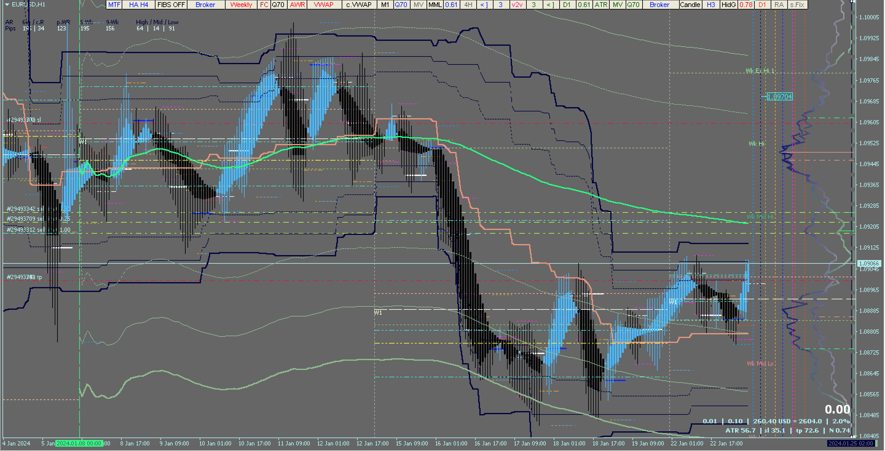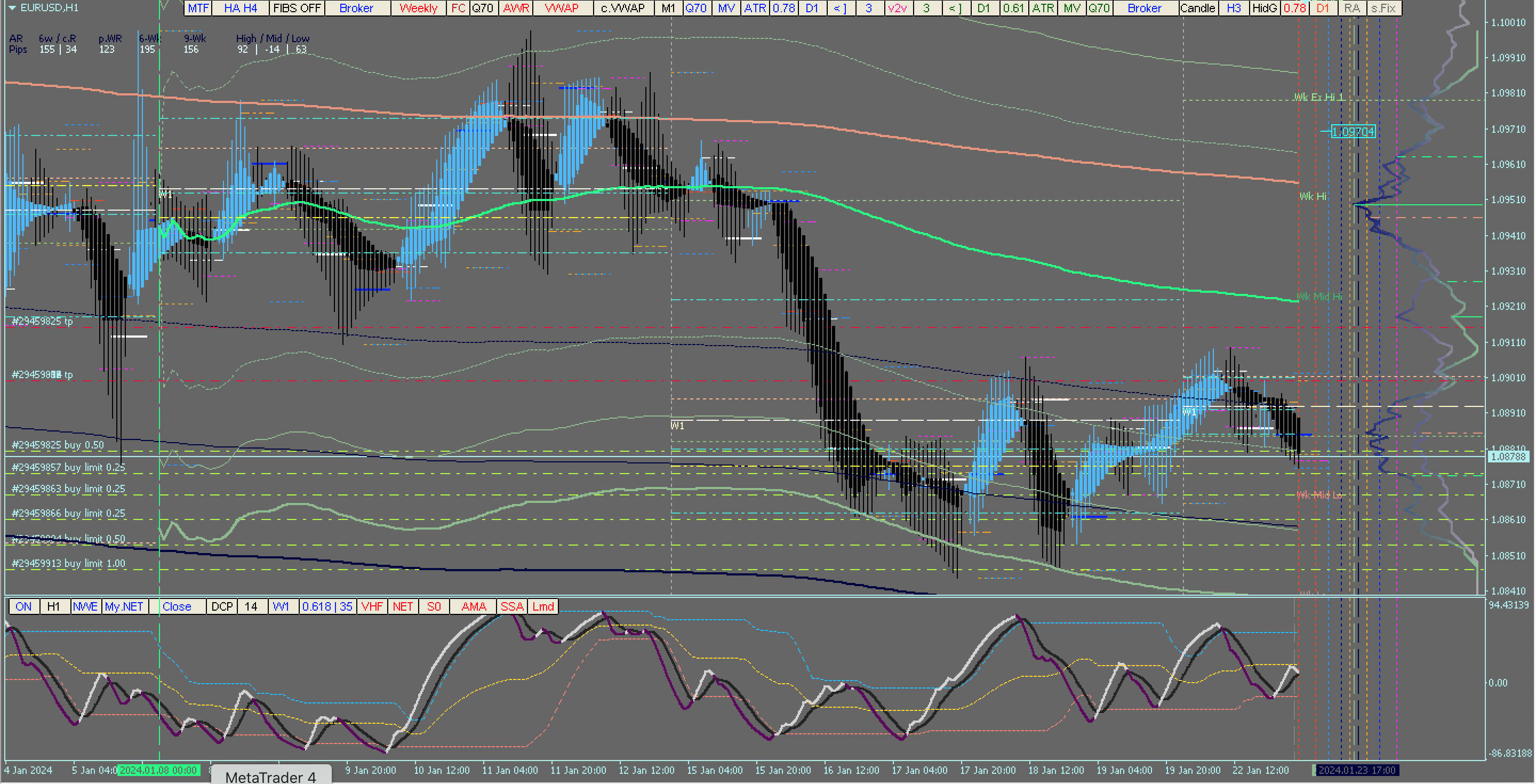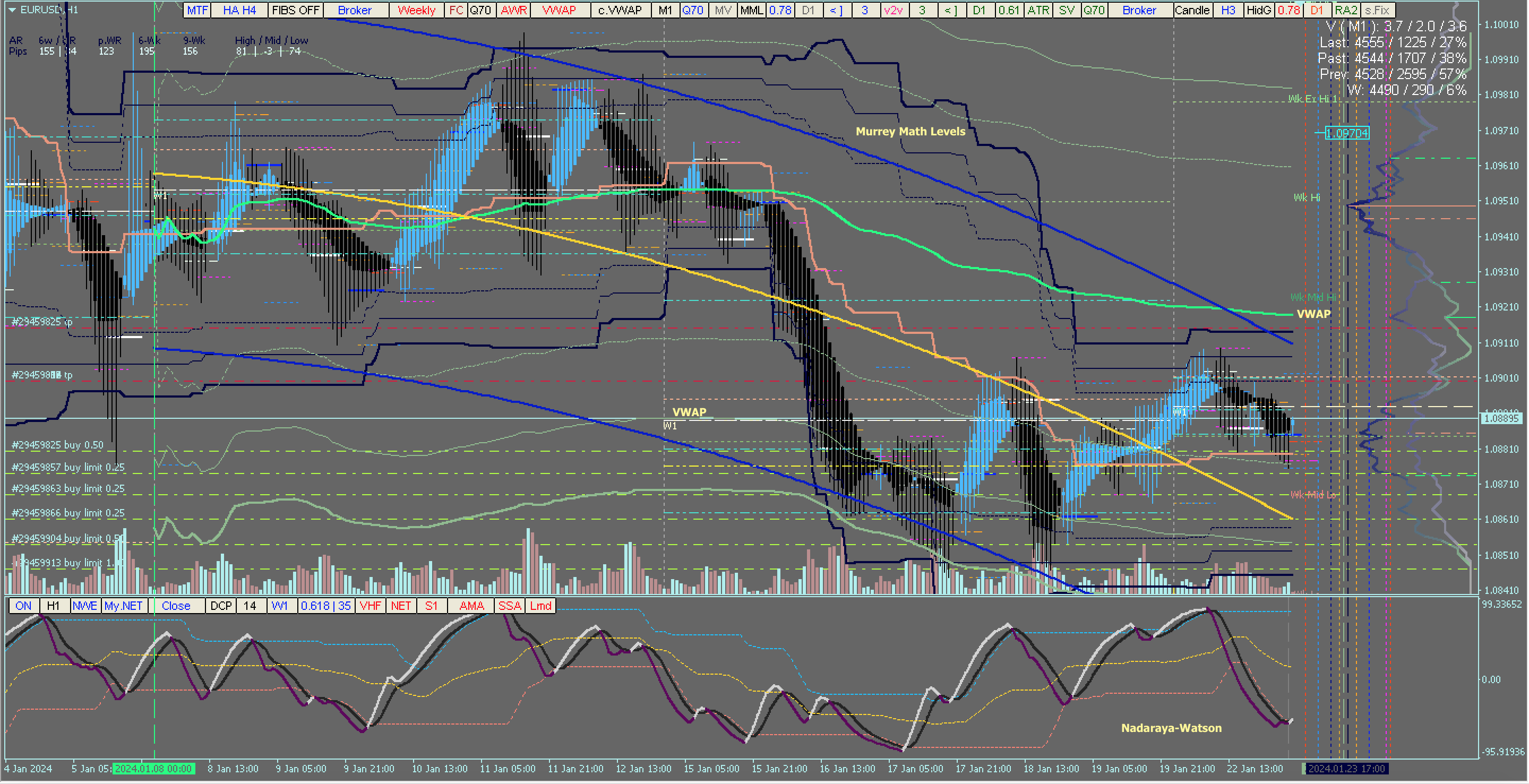 ​​​​​​​EUR/USD : H1 TF : Weekly VWAP : Volume Profile Nadaraya-Watson Estimator (momentum osci): open & pending positions