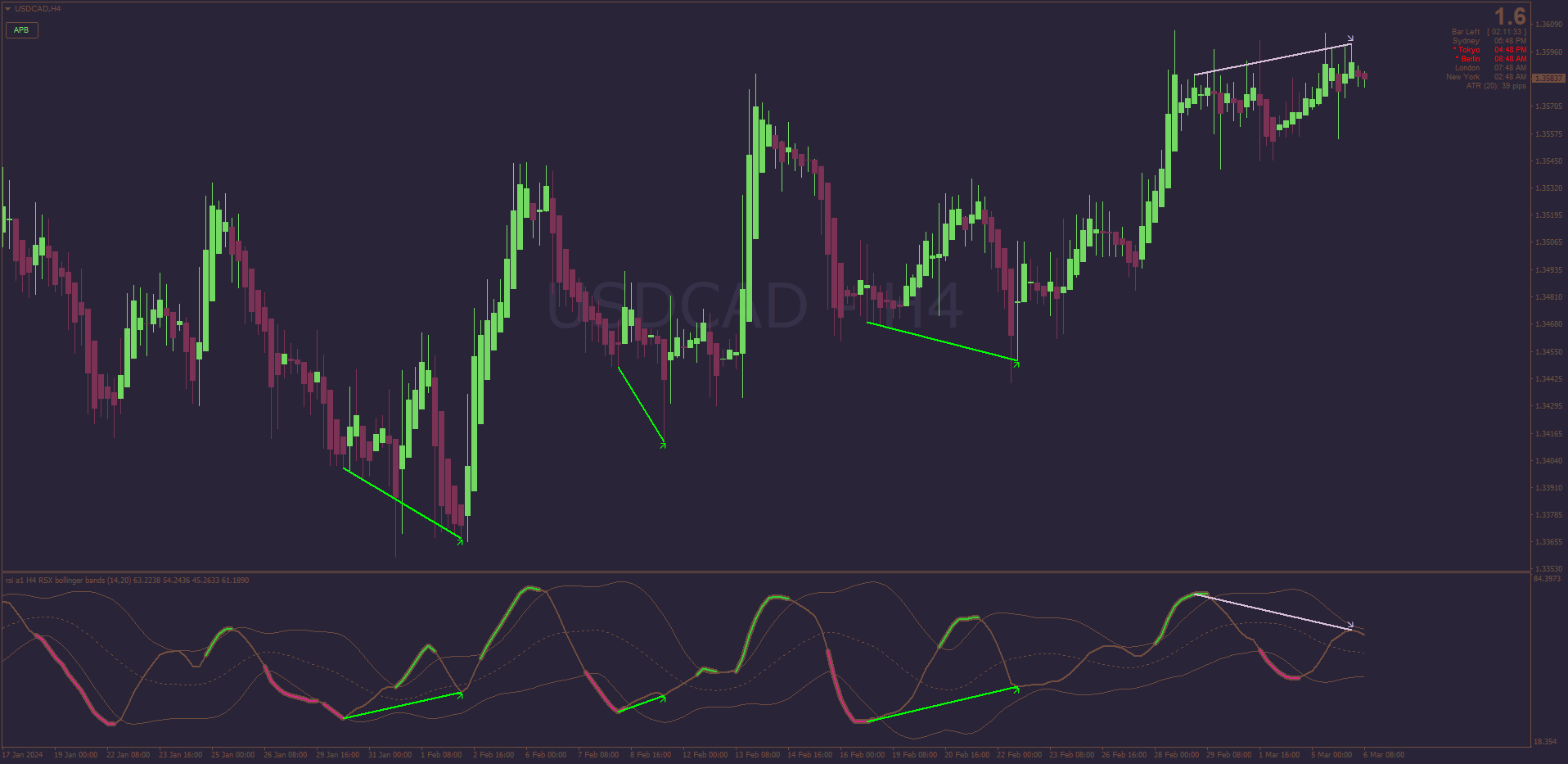 For traders who would like to try it using a Dark Mode MT4 template, please try this setup which includes Heiken Ashi APB (Average Price Bars) on your 4 hour charts (any pair):
