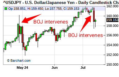 The last time they "intervened" was in April 2024 which you will see on the charts as large spikes.