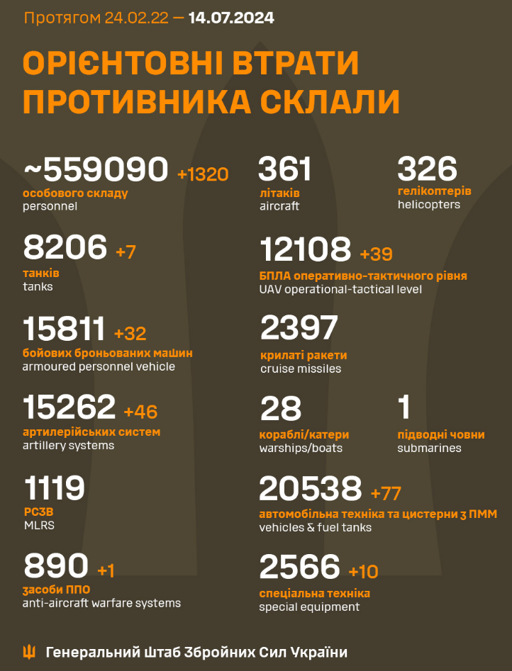 The total combat losses of the enemy from 24.02.22 to 14.07.24 were approximately: