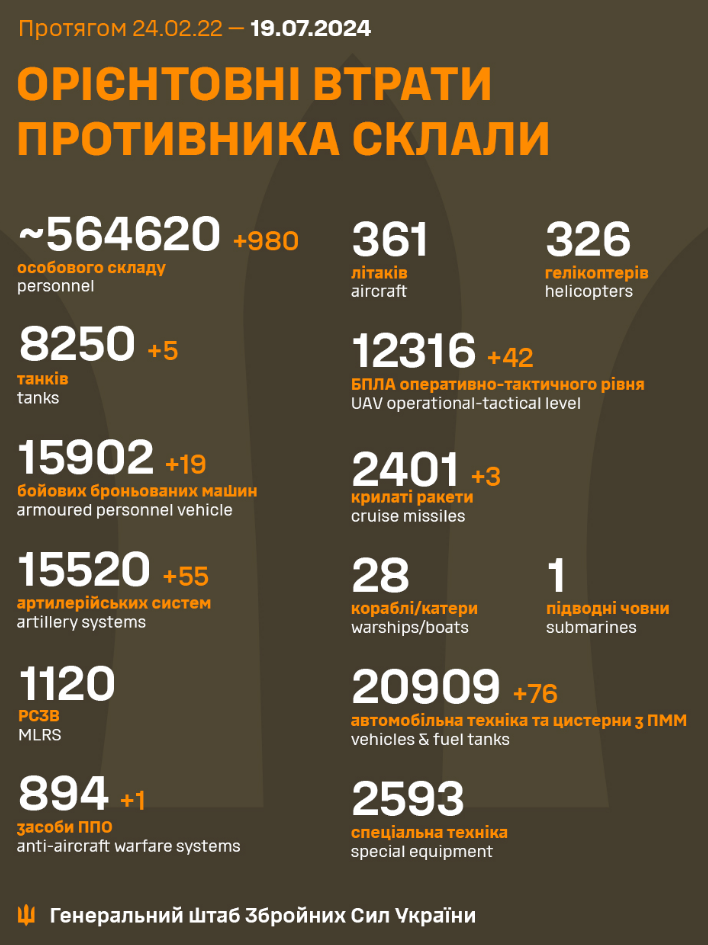 The total combat losses of the enemy from 24.02.22 to 19.07.24 were approximately: