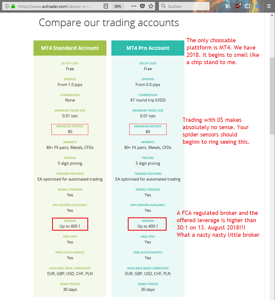 5When some points are strange with this broker better don't touch it. Only small brokers have MT4 only in 2018. Small or unknown doesn't mean automatically bad, but it is an additional risk. AxiTrader is no new broker, but quiet unknown I would say. This broker obviously try to attract unexperienced clients. Normally, as good broker you want experienced clients, especially now with the ESMA restrictions where you can give them professional status.