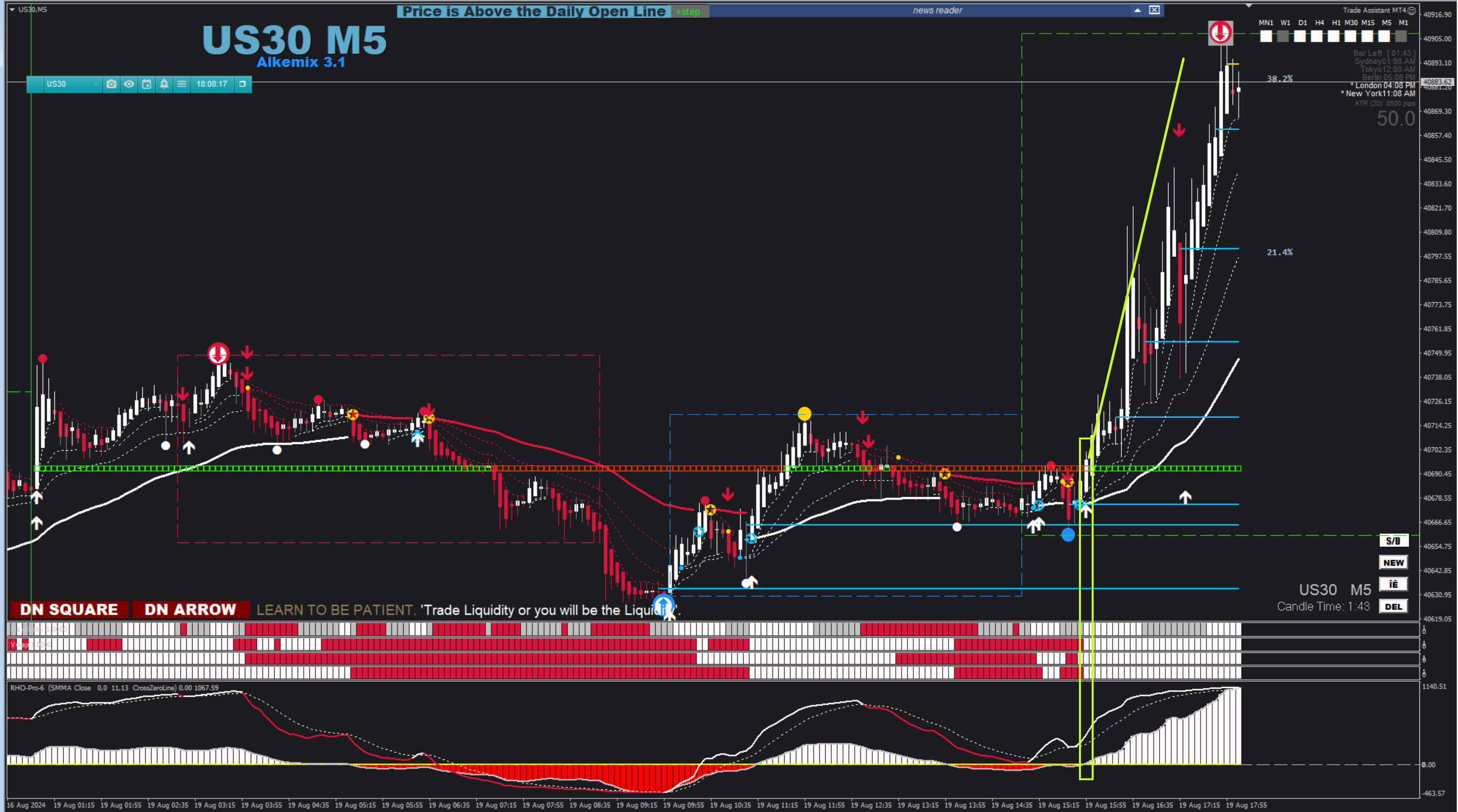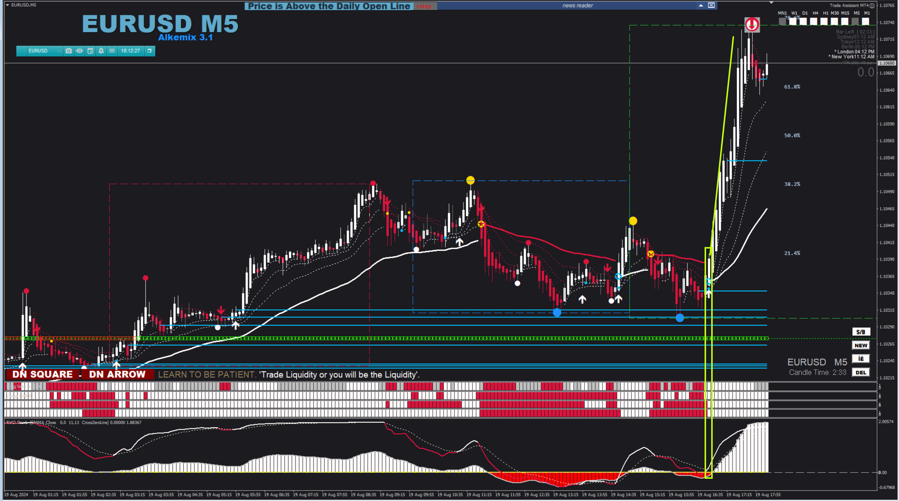 Excuse my ignorance and my insistence. I understand that the highest TF to operate at 5M is 30M. But when looking at the 30M chart I still see that the last closed candle is red. Is there something else I'm missing? If it is by structure, it is true that there are two previous higher highs at 30M, creating a CHOCH at 5M. Do you rely on that or do you have another opinion?Cagliostro wrote: Fri Aug 23, 2024 4:25 am HI Vertigo - if you set the chart on 1H you lose two histo lines. The max TF you can use with this specific configuration of the system is 30M. The last two histo indicators are higher TF bias monitored by Gann. If you trade on 5M you don't need to check other TF unless you want to verify the alignment of Zigzag trend. Possibly, if I have time, I can include settings for higher TF in the next version.