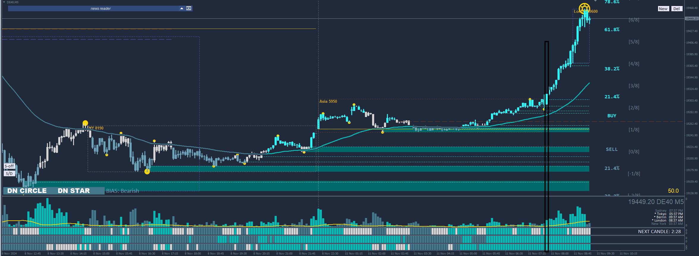 EMA breakout or bounce upwards after consolidation (in this case we had a pullback, after the break of Asian range)