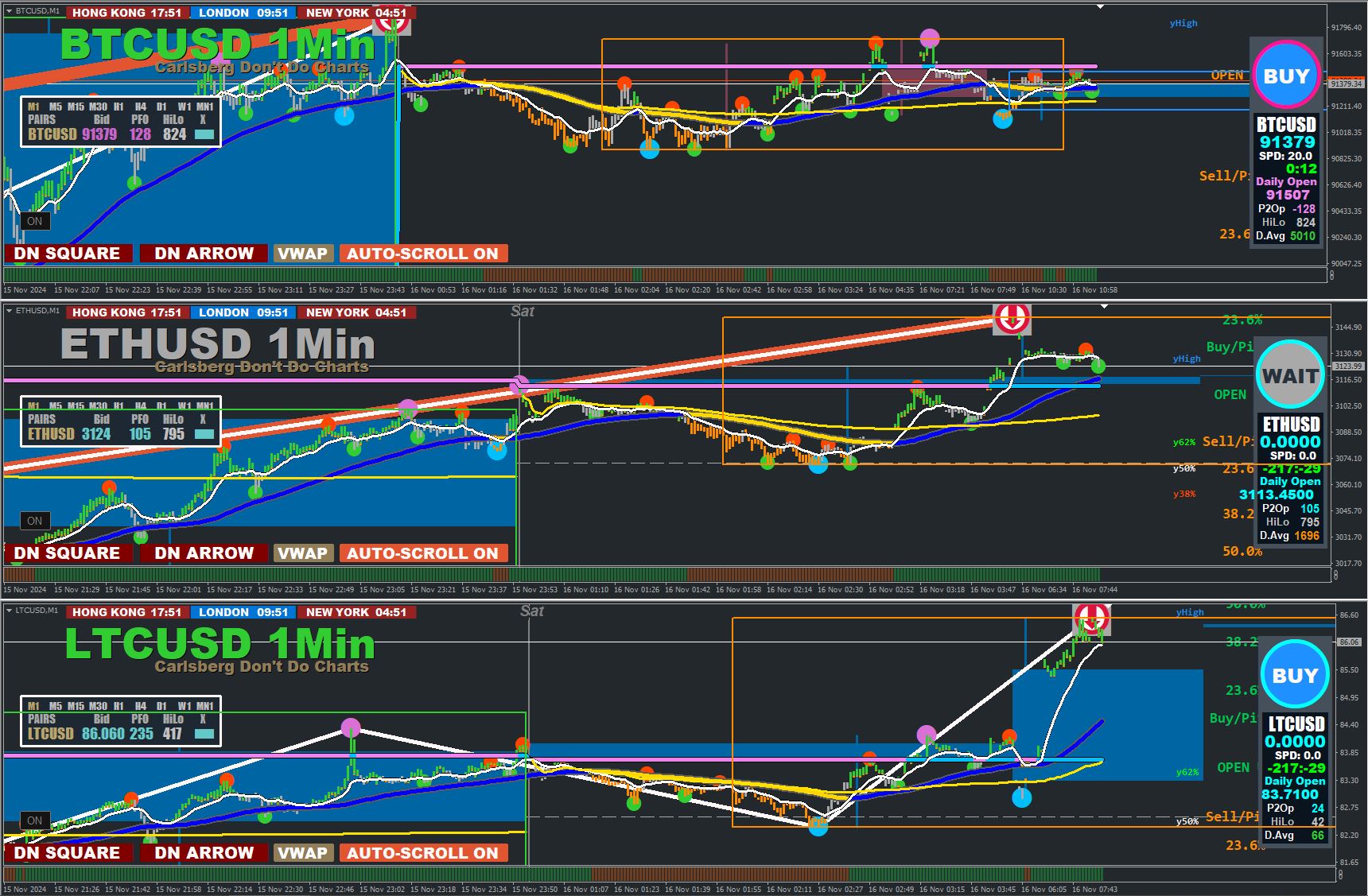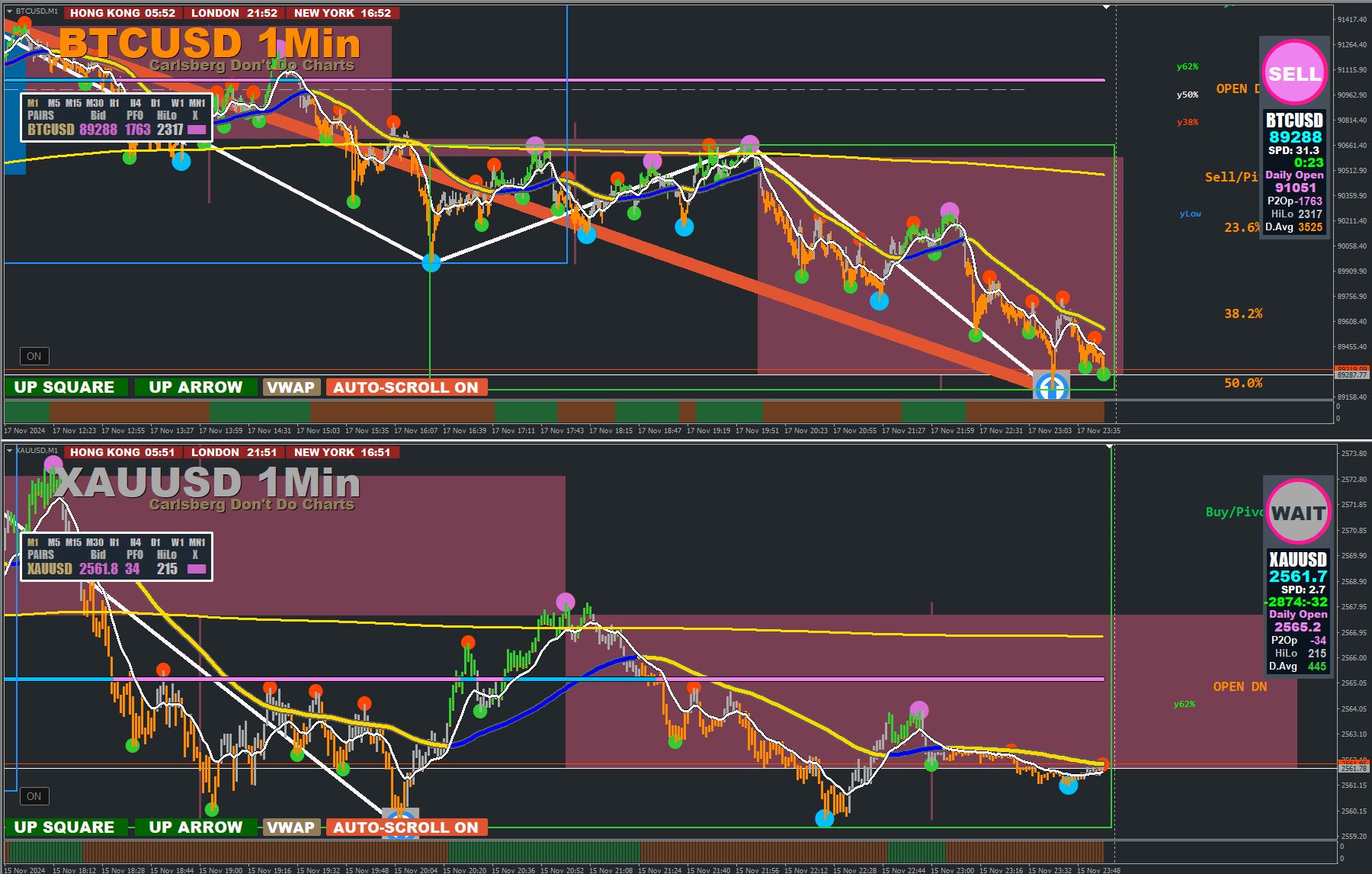 • Rapidly moving candlestick charts on an M1 timeframe.