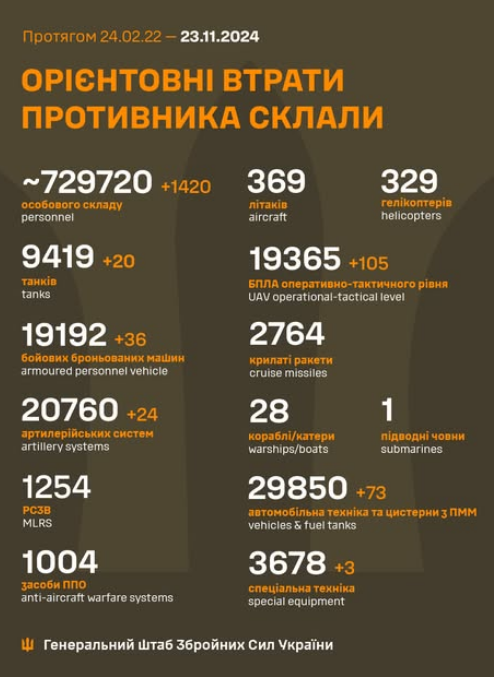 The estimated total combat losses of the enemy from 24.02.22 to 23.11.24 amounted to / The estimated total combat losses of the enemy from 24.02.22 to 23.11.24