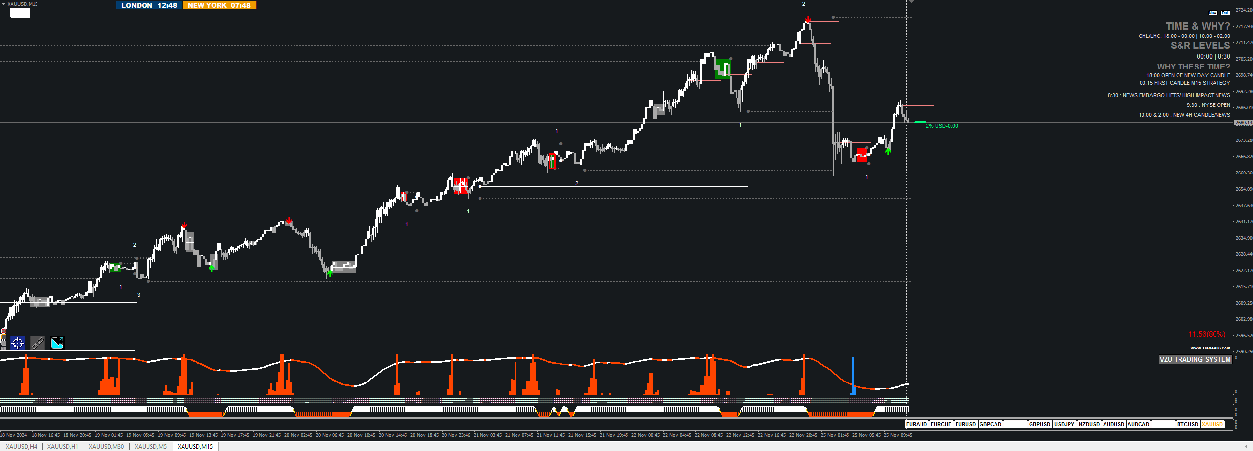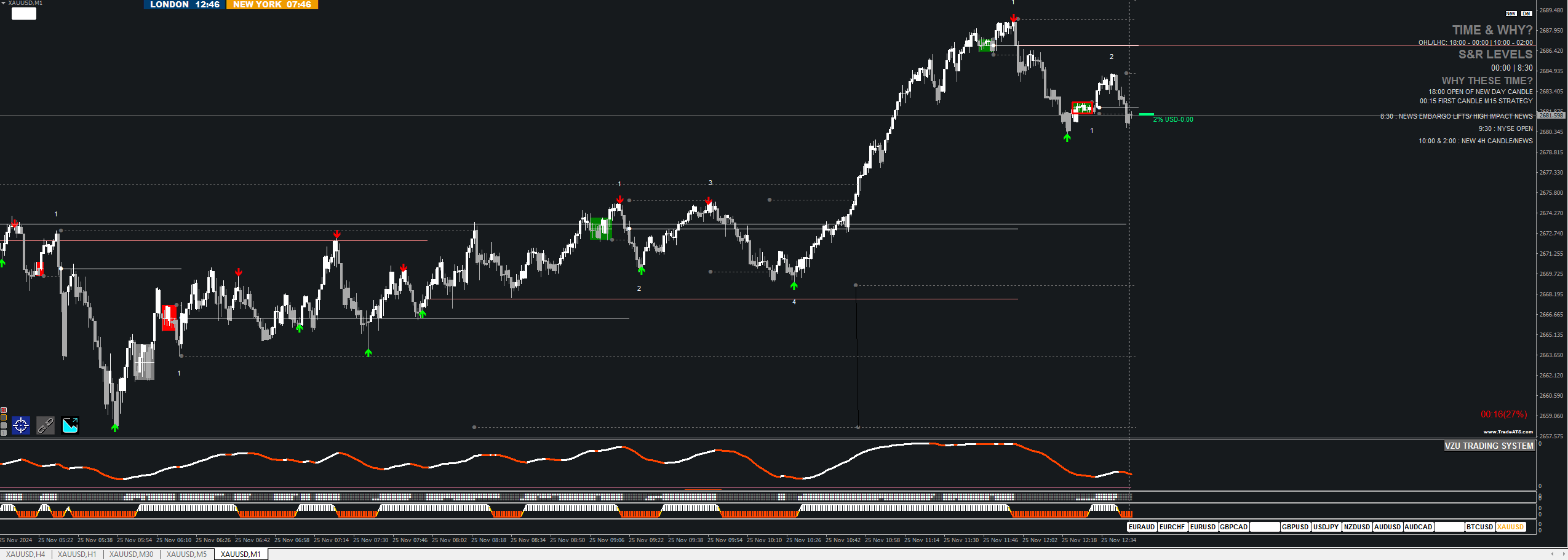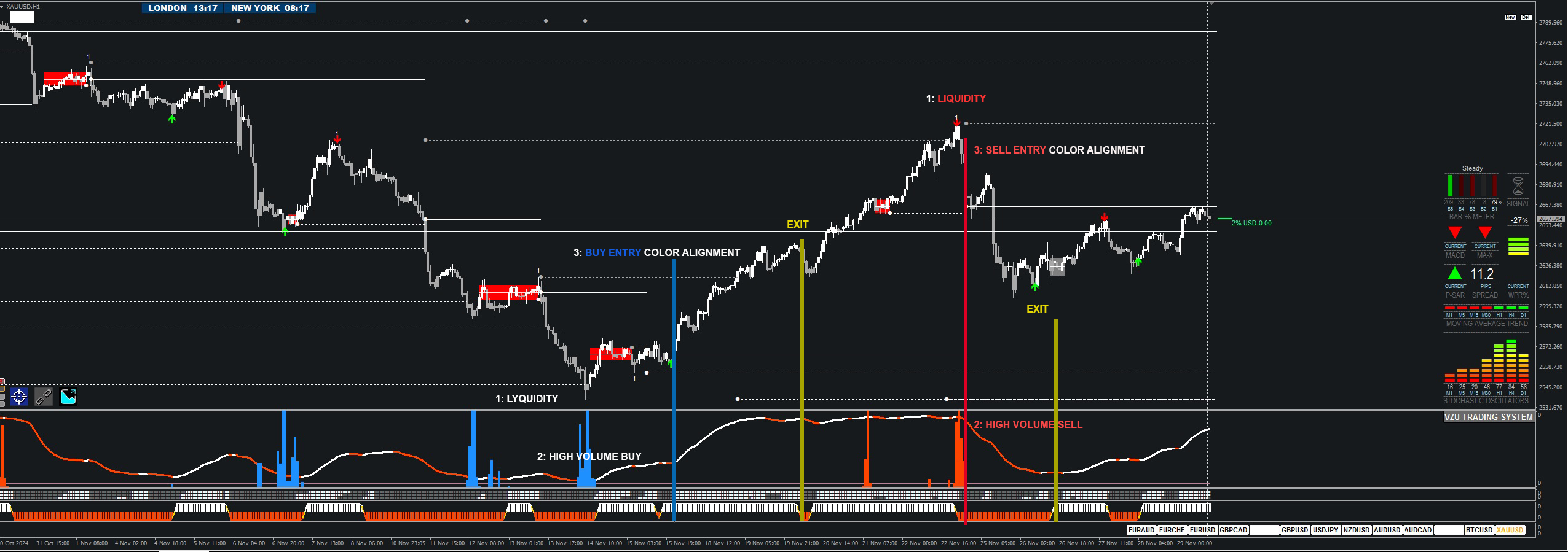 • Merge three timeframes: H1, M30, and M5, ensuring they align with the same color before entering a trade on M5.