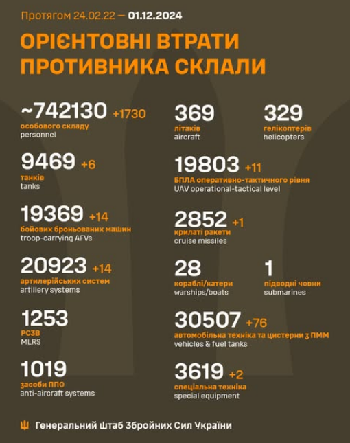 The estimated total combat losses of the enemy from 24.02.22 to 01.12.24 were approximately / The estimated total combat losses of the enemy from 24.02.22 to 01.12.24