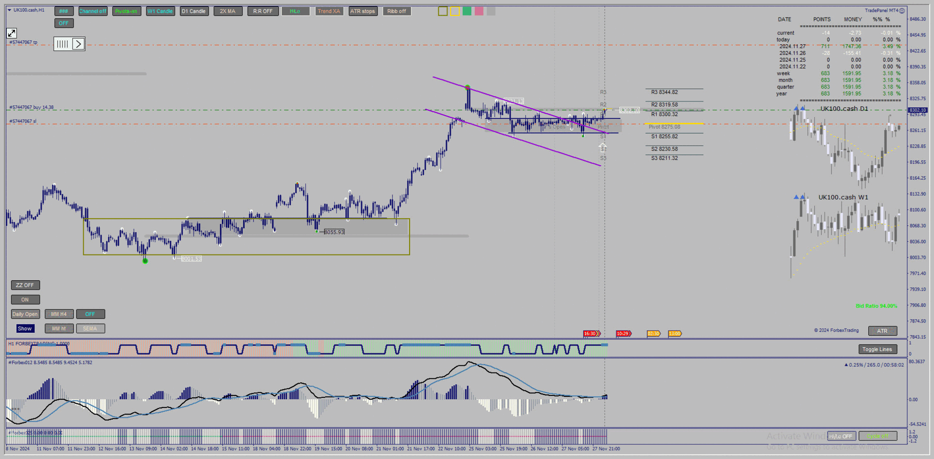 44For those adept at interpreting these tools, they aren't redundant but complementary, each adding a layer of meaning. You can toggle them at any time; otherwise, they provide a clearer picture when deciding on entries, exits, and managing trades effectively. Ahh... of course, one has to understand their meaning!Cagliostro wrote: Wed Nov 27, 2024 7:04 am Beautiful colors but remove 50% of the indicators. They are redundant information and create only a great sense of confusion.