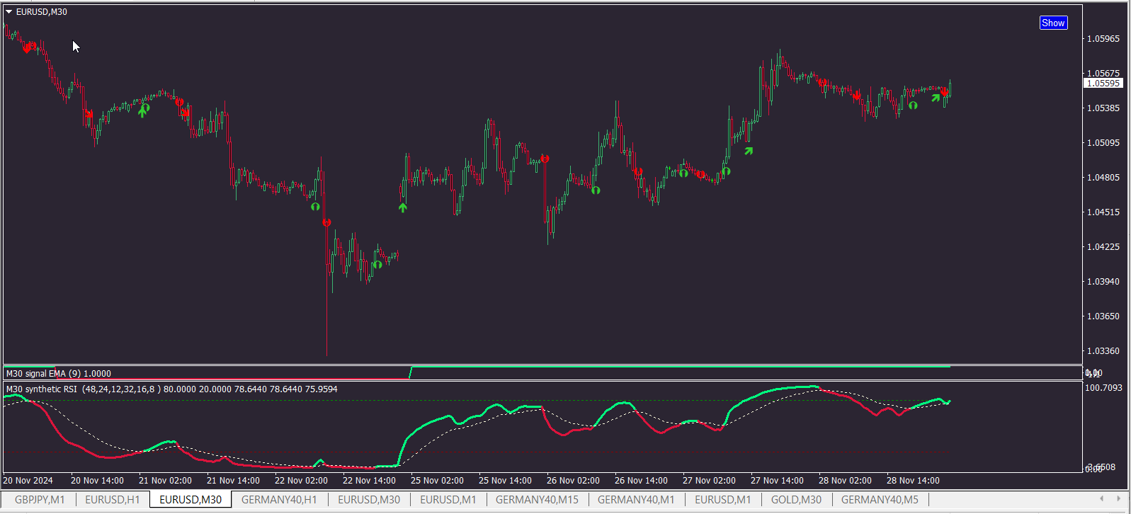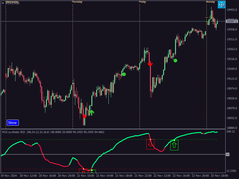 1. When the synthetic Rsi line Enter the 80 level, there will be Entry & Exit arrows. Same for when the line enter 20 level.