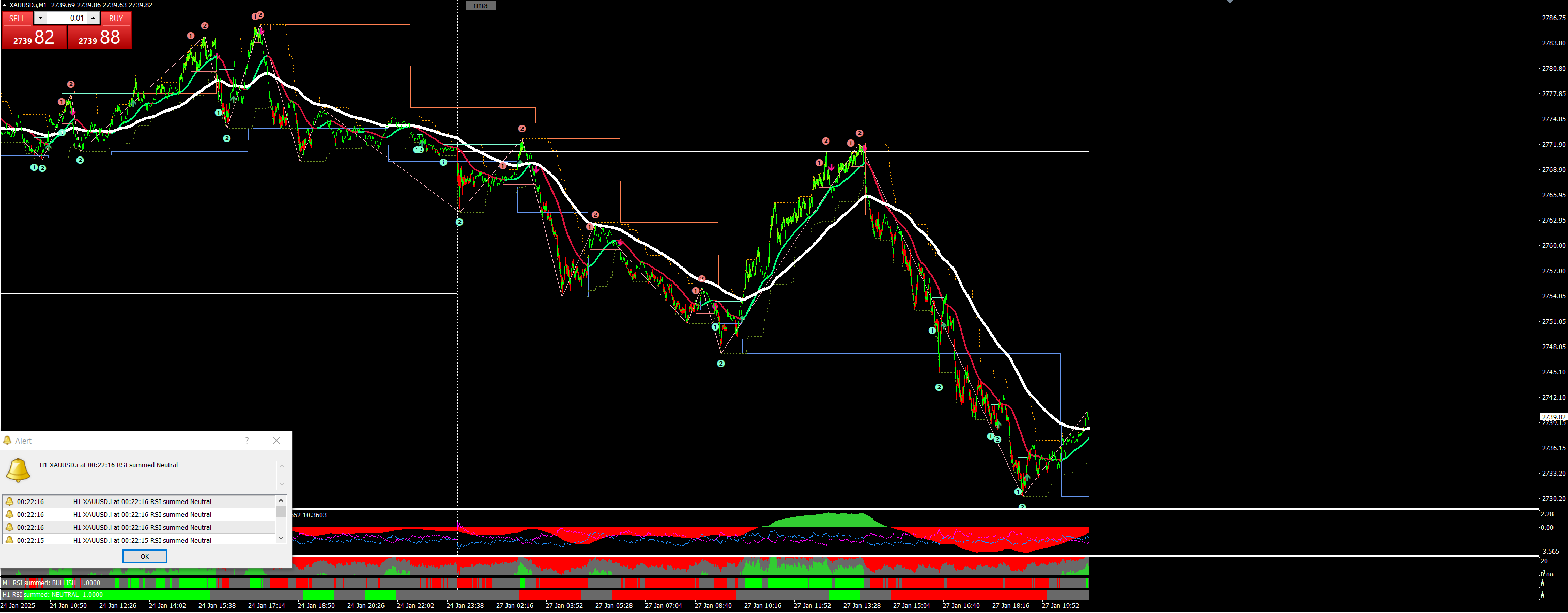 It can be contended that this state could be determined by examining only the slowest RSI; however, this is not always the case, as it significantly depends on the periods selected. Therefore, the indicator will assess all the specified RSI values.