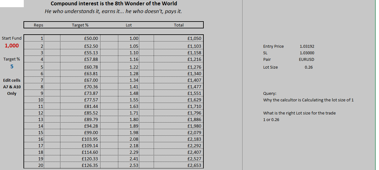 I’m also using Mister Xard’s calculator, where I entered $1000 as the balance and 5% target. However, calculation showed Lot size 1, which is approximately four times higher than 0.26) . Seems like I might be missing something here also