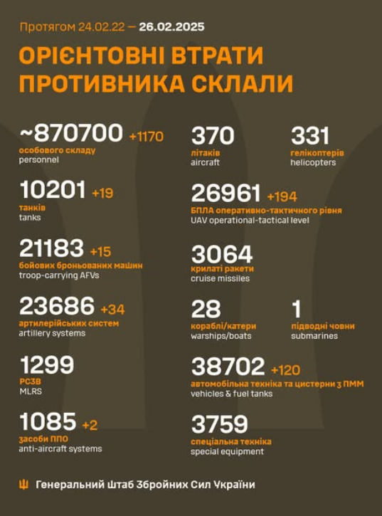 The estimated total combat losses of the enemy from 24.02.22 to 26.02.25 were approximately /