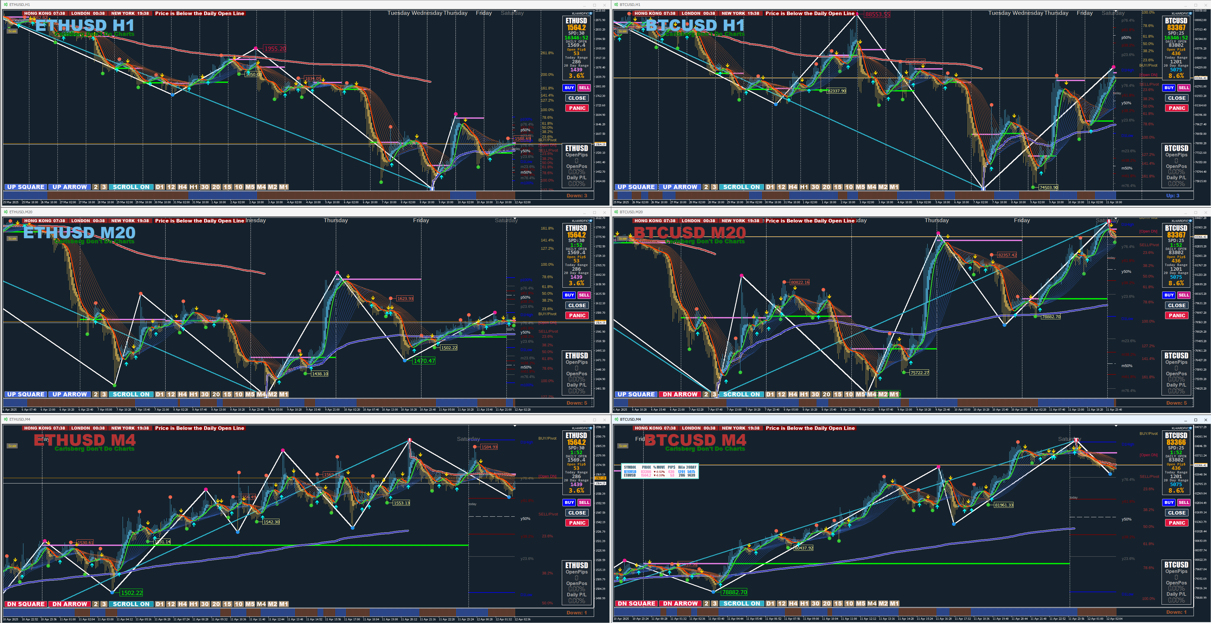 Example: In the screenshot, M4 for both ETHUSD and BTCUSD shows "DN SQUARE & DN ARROW", indicating a pullback within the H1/M20 bullish trend, presenting a buying opportunity.