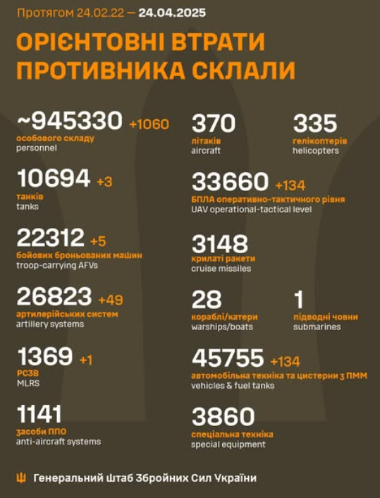 The estimated total combat losses of the enemy from 24.02.22 to 25.04.25 were approximately /
