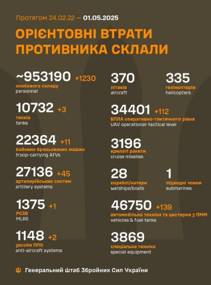 The estimated total combat losses of the enemy from 24.02.22 to 29.04.25 were approximately /