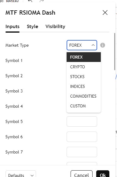 Choose Your Market: Select the market type (FOREX, CRYPTO, STOCKS, etc.) to match what youâre trading. If youâre working with something unique, pick âCUSTOMâ and input your symbols manually.