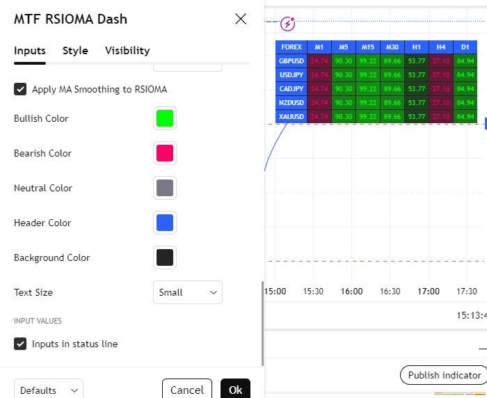 Tweak Settings: Adjust the RSIOMA period (default 10) and MA smoothing period (default 7) to make the indicator more or less sensitive. You can also change colors and text size to suit your style.
