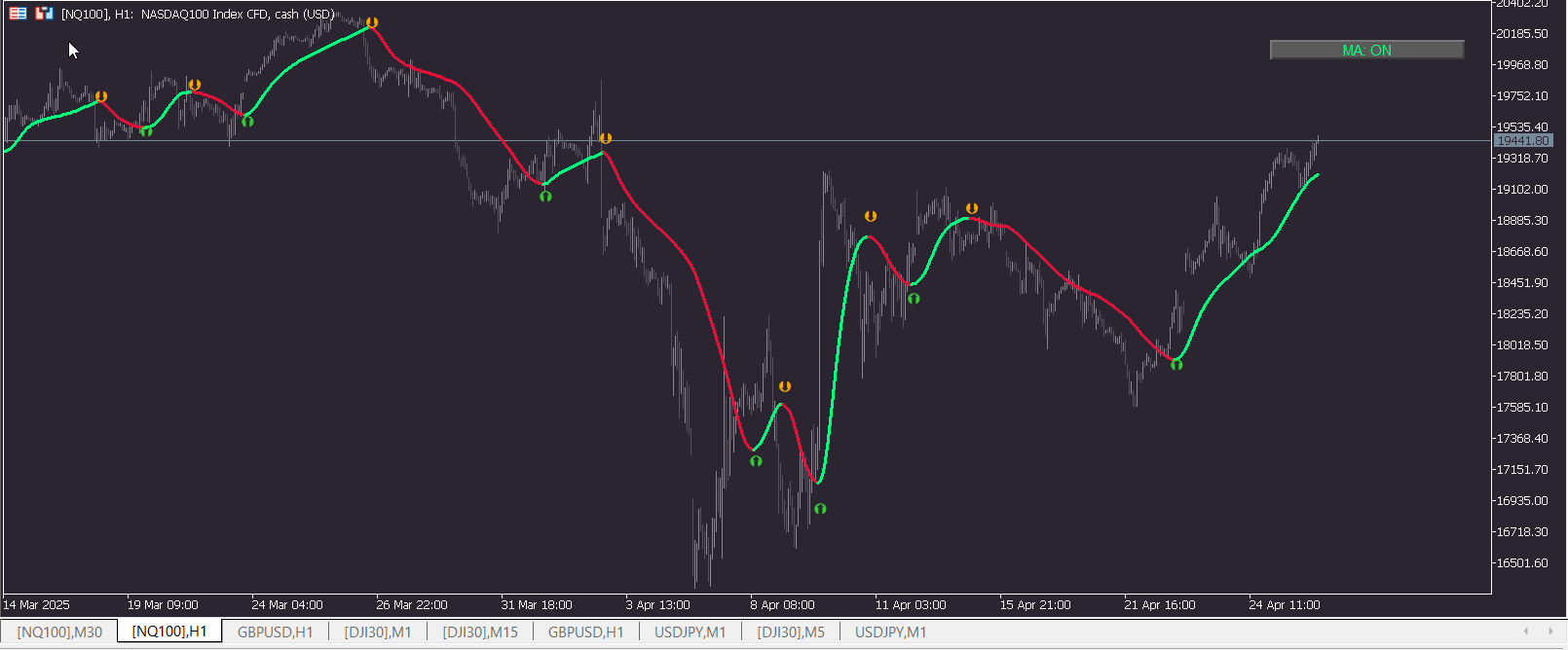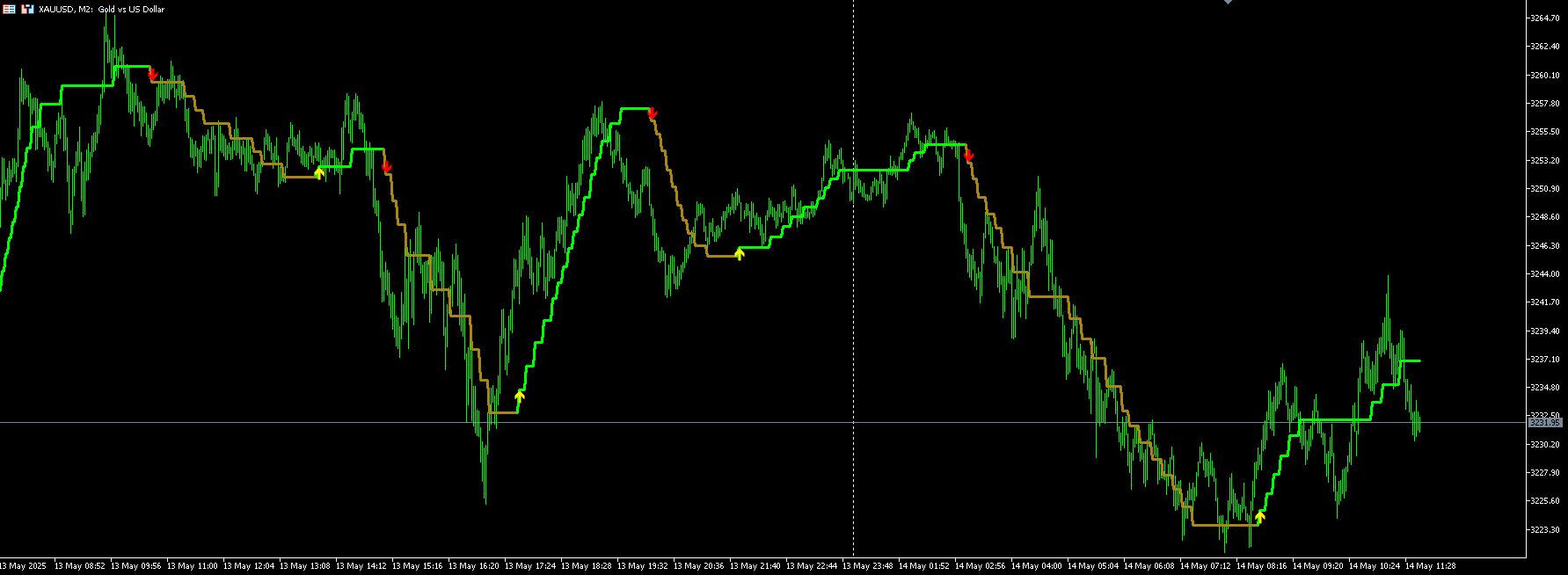 The indicator will plot a line that changes color based on trend direction, with optional signals displayed as arrows on the chart. The GKYZ filter helps reduce noise in both the price input and the resulting moving average, creating a smoother representation of price movement.