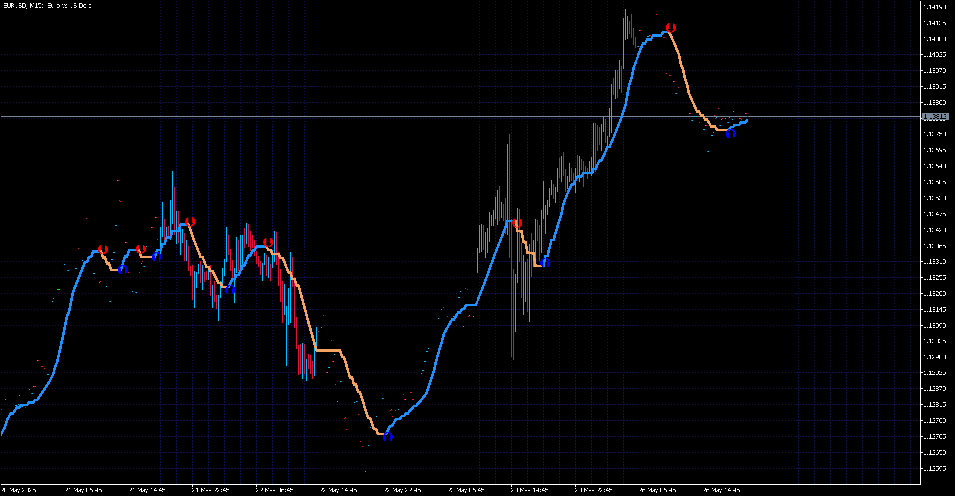 The indicator will plot a line that changes color based on trend direction, with optional signals displayed as arrows on the chart. The GKYZ filter helps reduce noise in both the price input and the resulting moving average, creating a smoother representation of price movement.