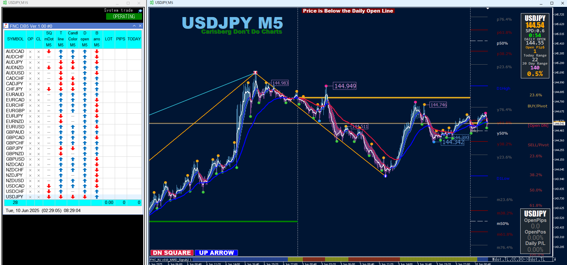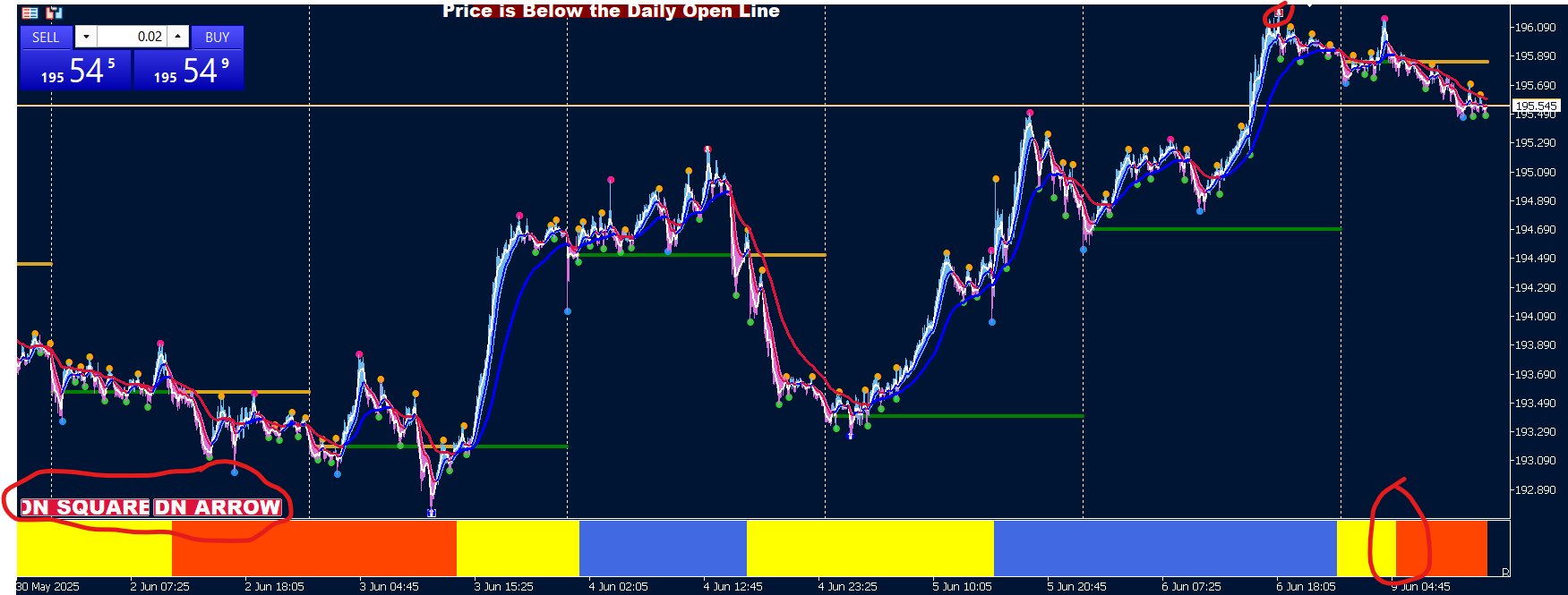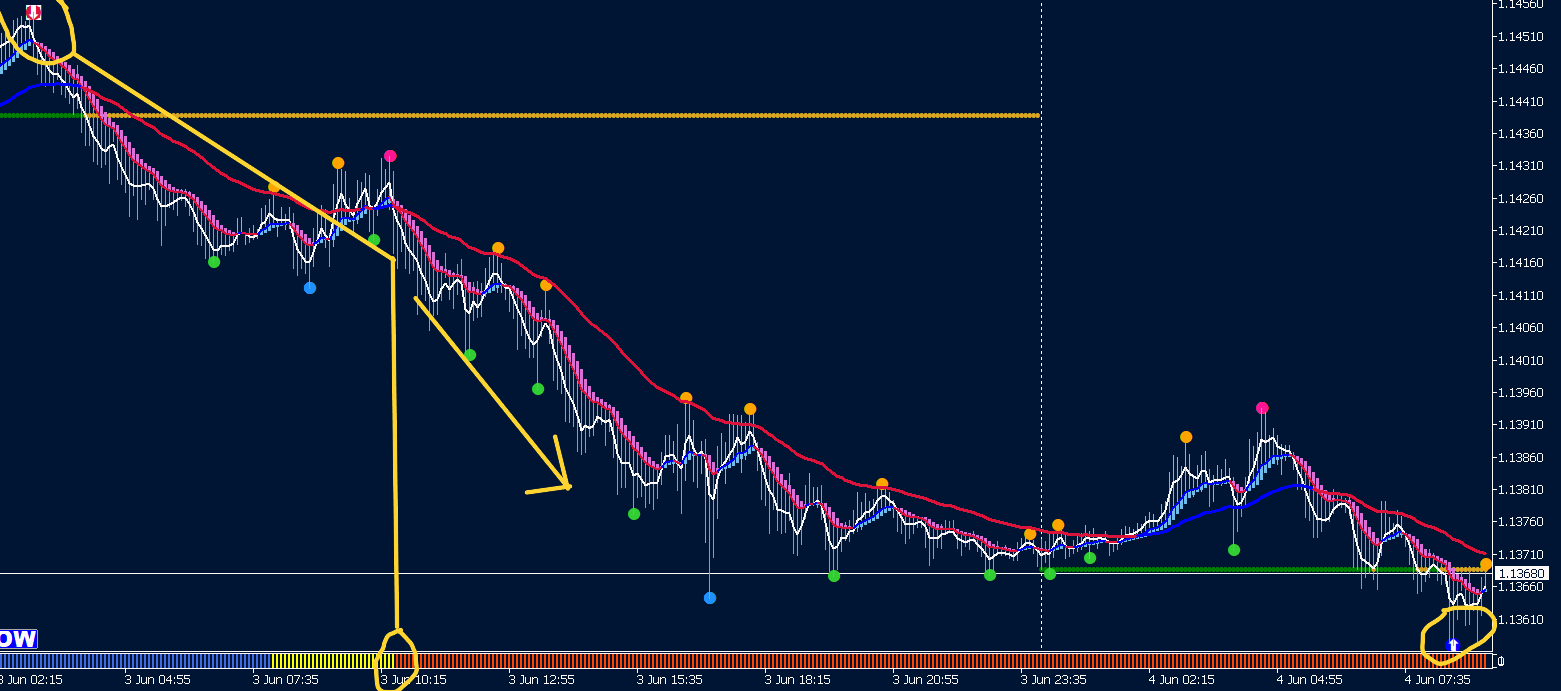 So let's say it's giving a sell signal, big arrow and big box down, now ea wait for signal indicator at bottom to turn red for sell to enter, exit point will be on opposite big arrow, but before big arrow shows, trades turn around and bottom signal indicator goes yellow or blue, ea only waits for bottom indicator to turn red again for second entry on same direction, almost like martingail but keeping volume the same, and because it only trades on big arrow and big box for entry and big arrow for exit it is very strong chance of moving the right direction, at most I had like 2 entries on one direction before it showed signal for opposite to exit