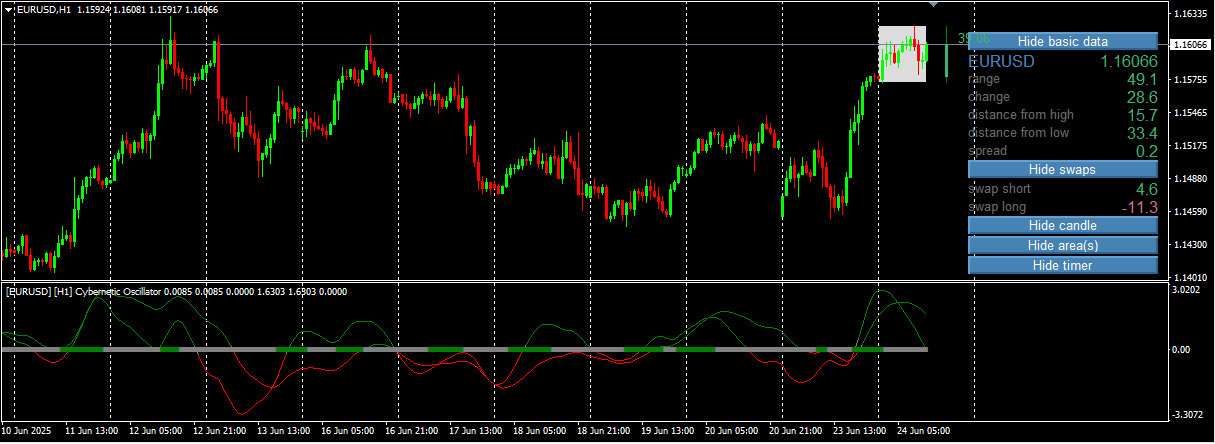 This script implements the Cybernetic Oscillator introduced by John F. Ehlers in his article "The Cybernetic Oscillator For More Flexibility, Making A Better Oscillator" from the June 2025 edition of the TASC Traders' Tips. It cascades two-pole highpass and lowpass filters, then scales the result by its root mean square (RMS) to create a flexible normalized oscillator that responds to a customizable frequency range for different trading styles.