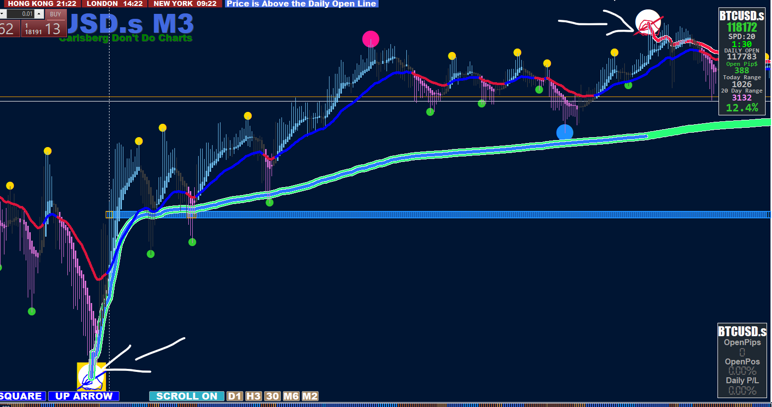 I think it refers to this: Bias and Cycle are short, and when the price crosses Ema 36, the candles should change to red and do not. I don't know if I'm right. A pleasure greet you all again.