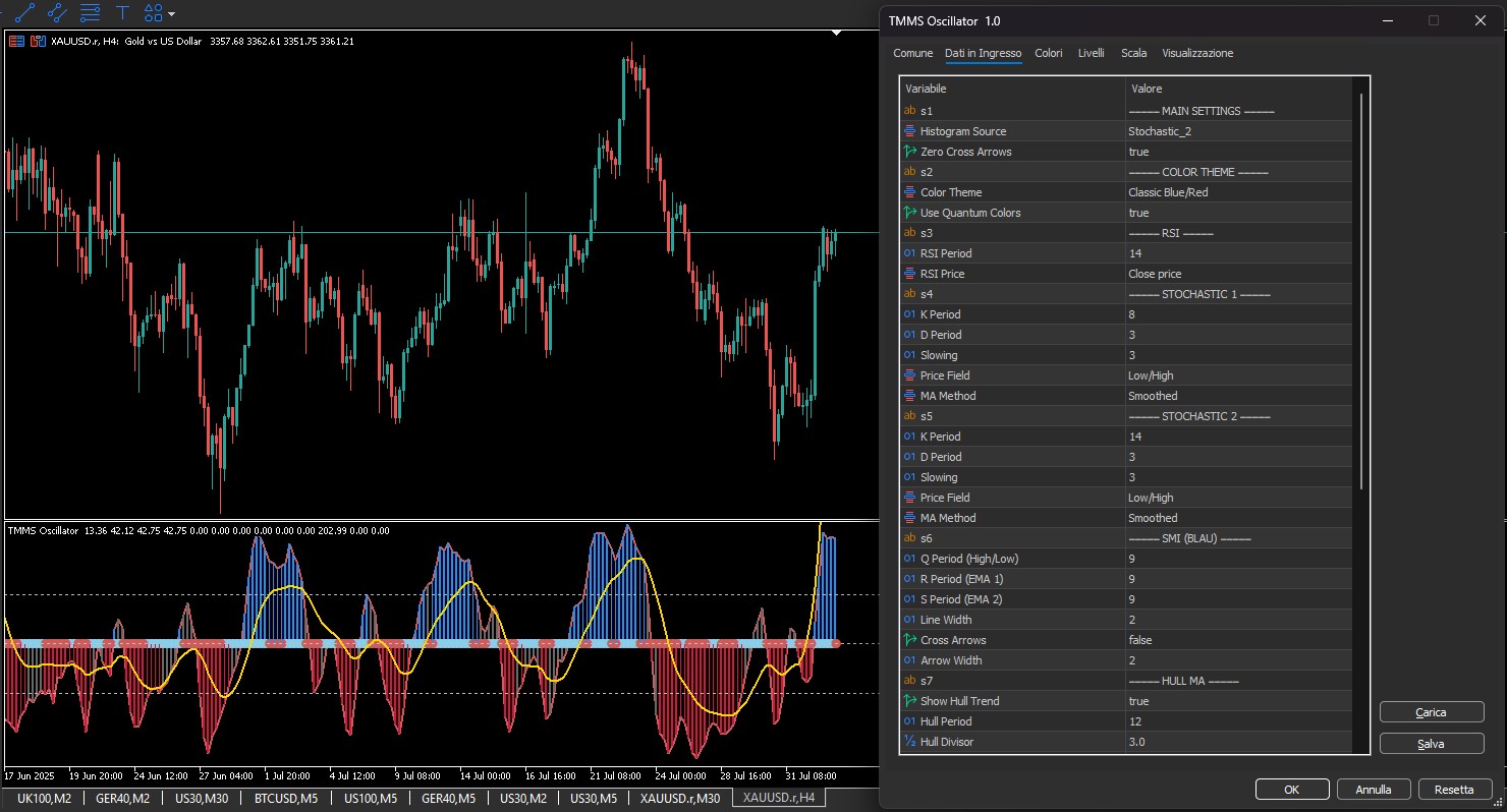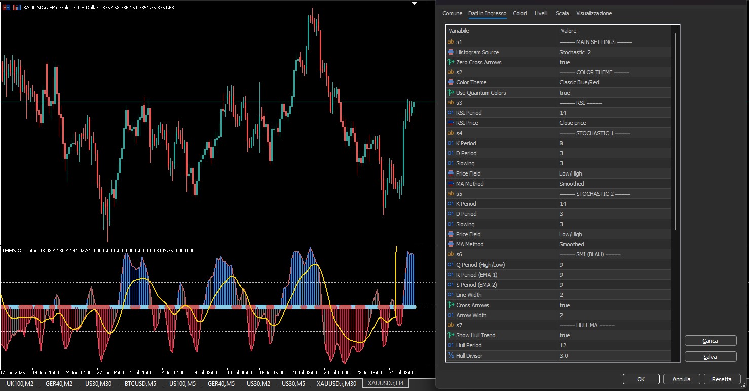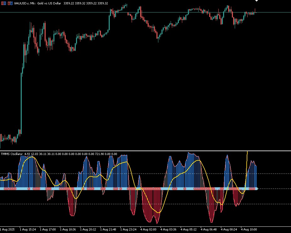 The TMMS (Trading Made More Simpler) Oscillator combines RSI, dual Stochastic, and Blau's SMI (Stochastic Momentum Index) to identify high-probability market turning points. The indicator features adaptive histogram coloring based on momentum convergence: green when all oscillators are bullish, red when bearish, and white during divergence states. Originally developed by SwingMan, it was part of a complete trading system developed in 2019 for "beginners, lazy traders and old men".
