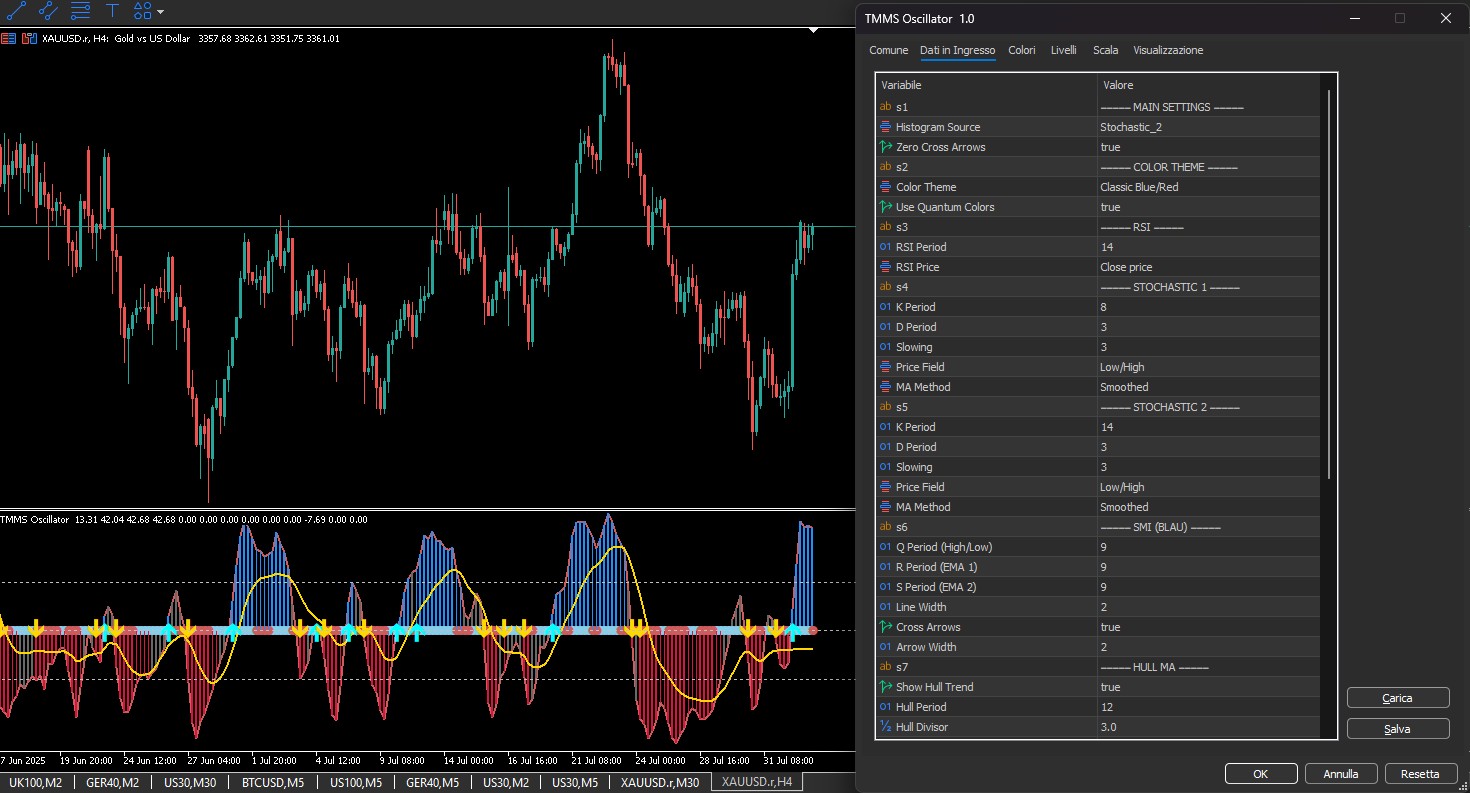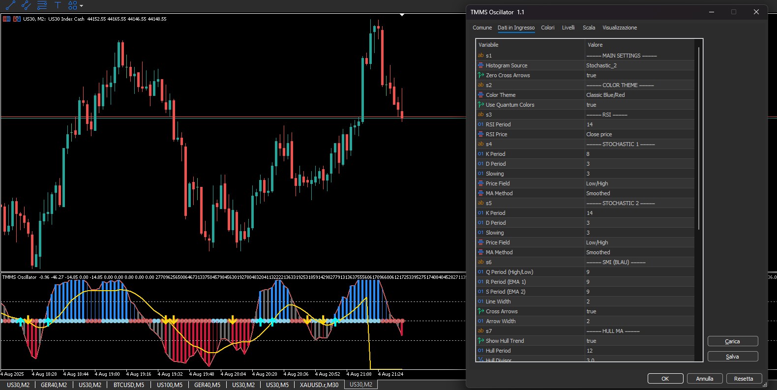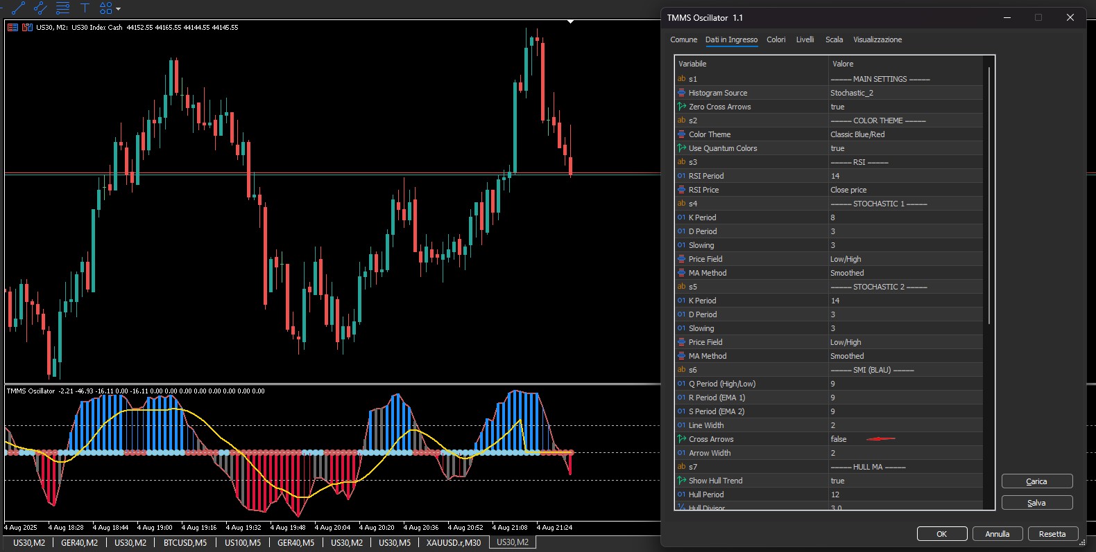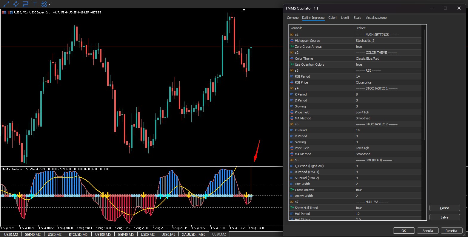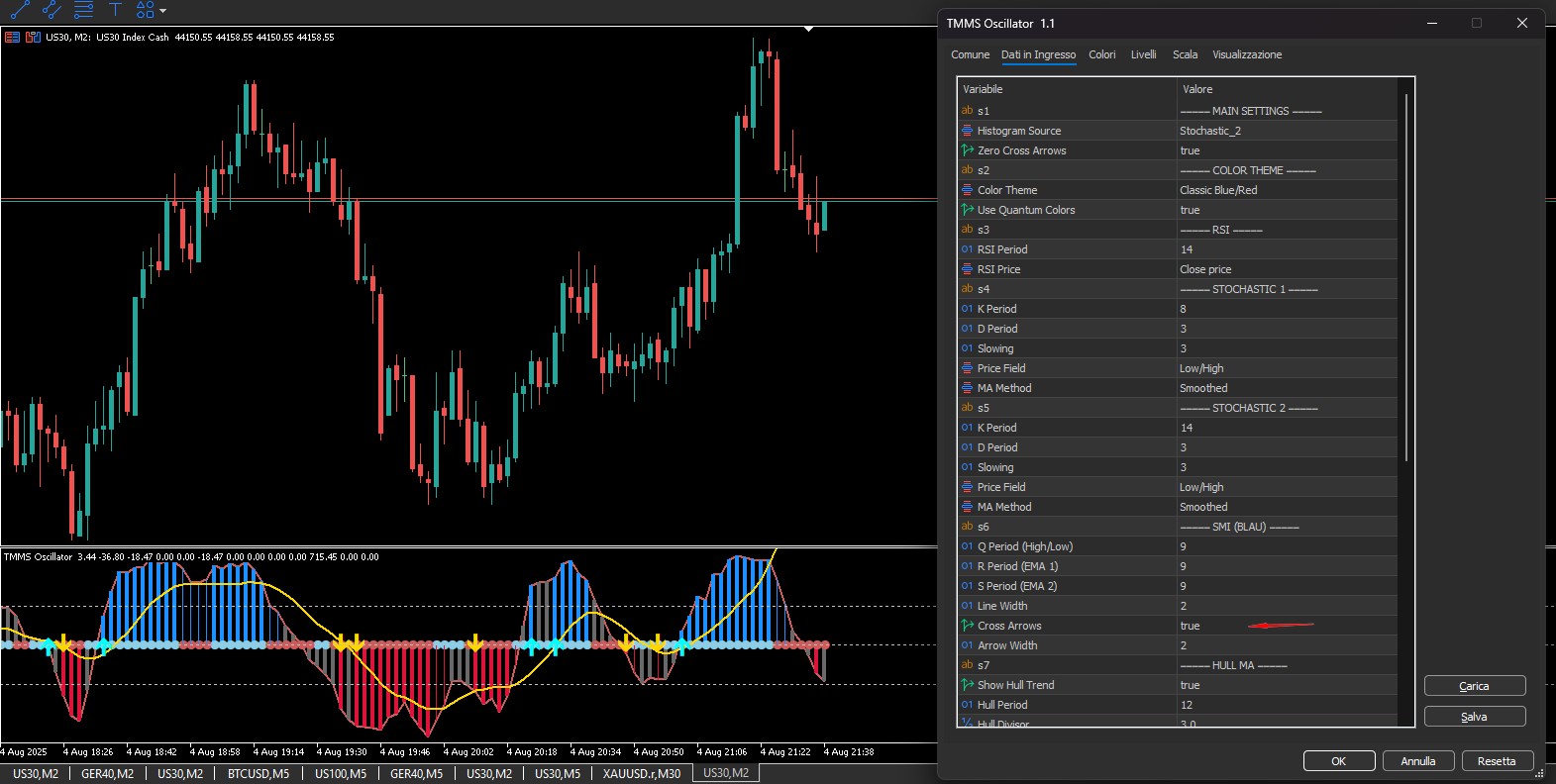Key features include Hull Moving Average trend dots that change histogram thickness when momentum conflicts with trend direction, providing early warning of potential reversals. The SMI line acts as a dynamic centerline with crossing arrows marking momentum shifts.