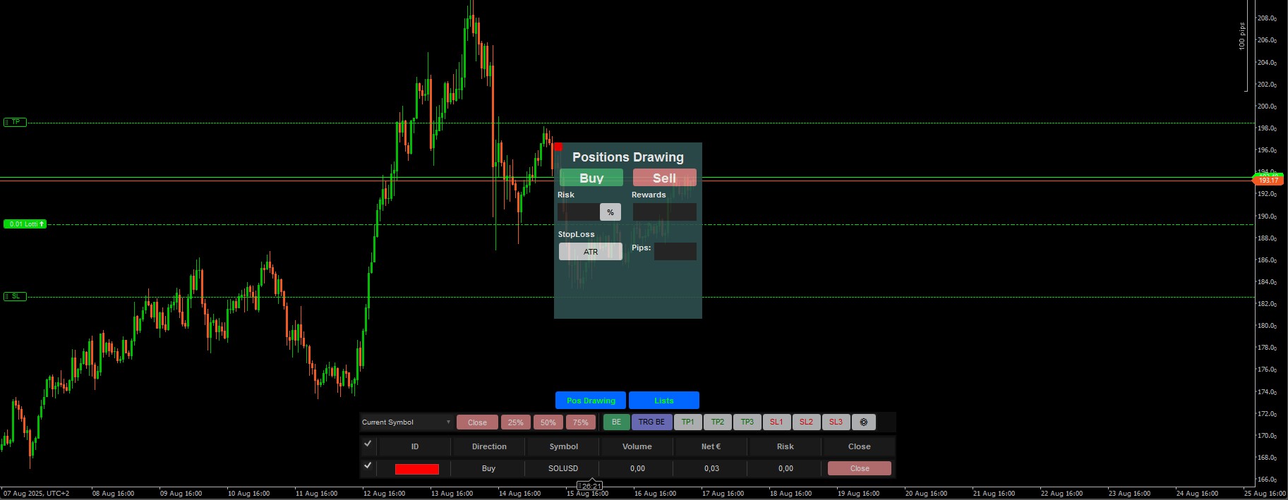 Hi Plon123. I’m currently programming three lines (entry, TP, and SL) that follow the price. I’m refining the code, and once I’m satisfied with it, I’ll create a button to enter the market.