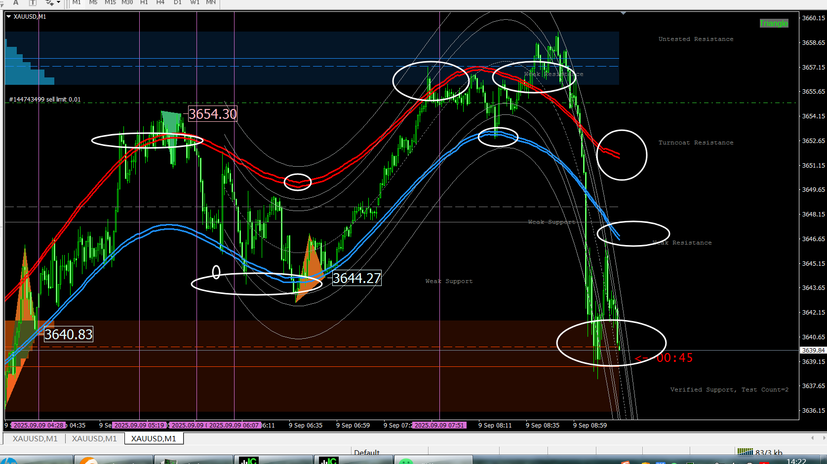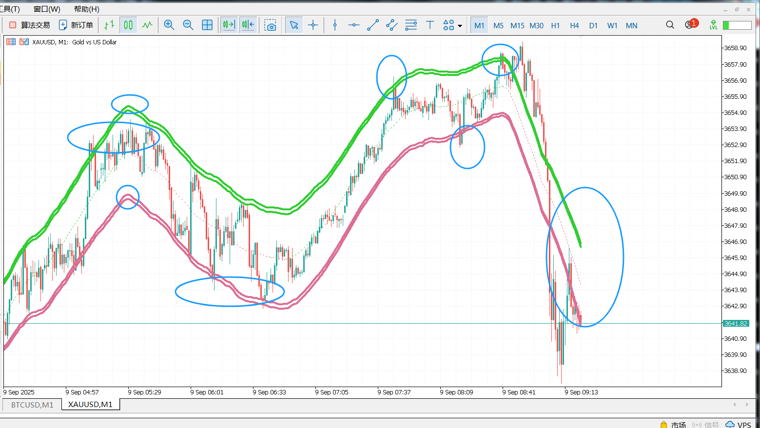 But I also noticed that the red and blue double lines in the original version aren’t actually fixed—they actually move slowly just like XMA! I never noticed that before~ Even so, there are still some obvious differences between the new indicator and the original MT4 one in certain places (I can’t even guess what special factors were added to the original version), like the spots I circled on the chart.