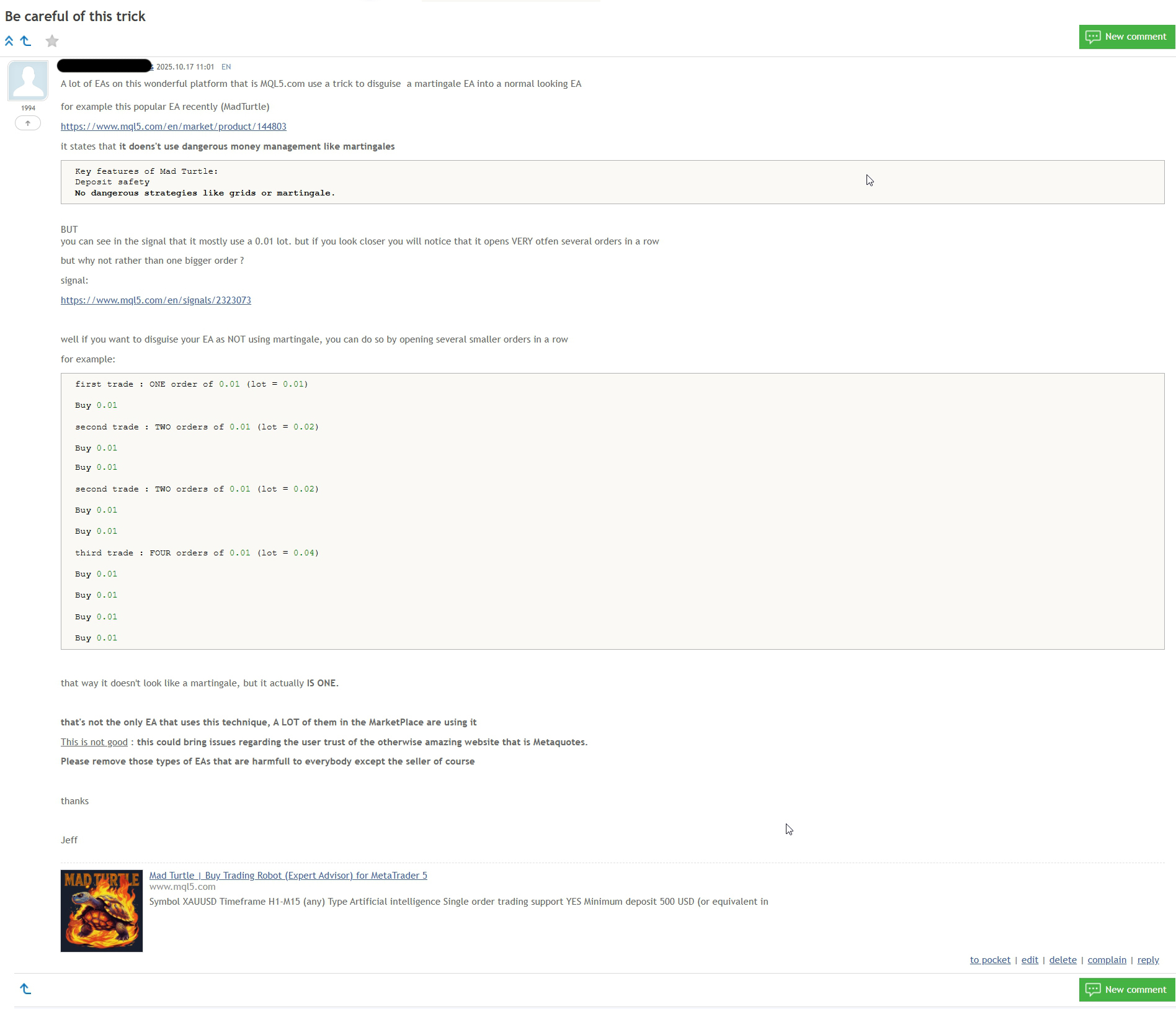 "This EA says it doesn't use martingales, but it diguises the lot increase by opening several 0.01 lots in a row : when you look quickly at the signal you don't really see lot increase, but it's there, it's just hidden from the user and disguised as normal trades.