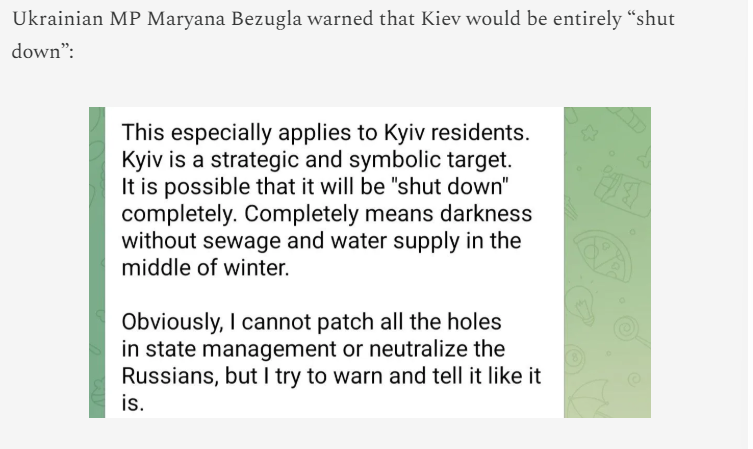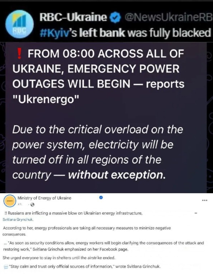 Escalation dominance: Following Ukraine's attack on a power station at the Russian city of Belgarod a few days ago interrupting electric power to 40,000 homes Russia has launched attacks on 13 major power plants across Ukraine. The state has just announced emergency blackouts for the whole country.