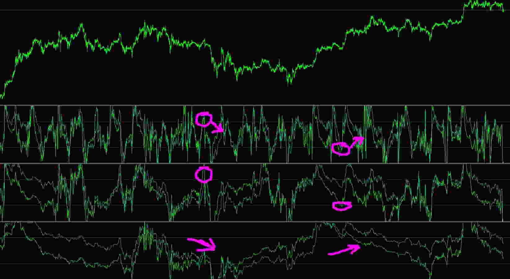 *The increasing/ decreasing momentum phases would be muted so that my other indicators function in a predictive manner until the momentum is confirmed.
