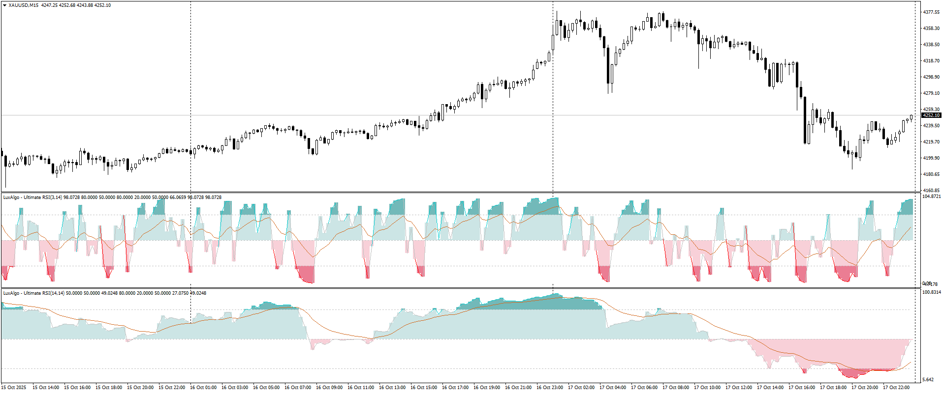 2nd Order Gaussian Filter: The Gaussian filter uses a bell-shaped curve to weigh the most recent price data more heavily than older data. A "second-order" filter applies this calculation twice to produce a smoother signal. As a high pass filter, it removes the lower-frequency price movements (the overall trend) to emphasize the higher-frequency, short-term movements. The result is an oscillator-like line that oscillates around a zero line.