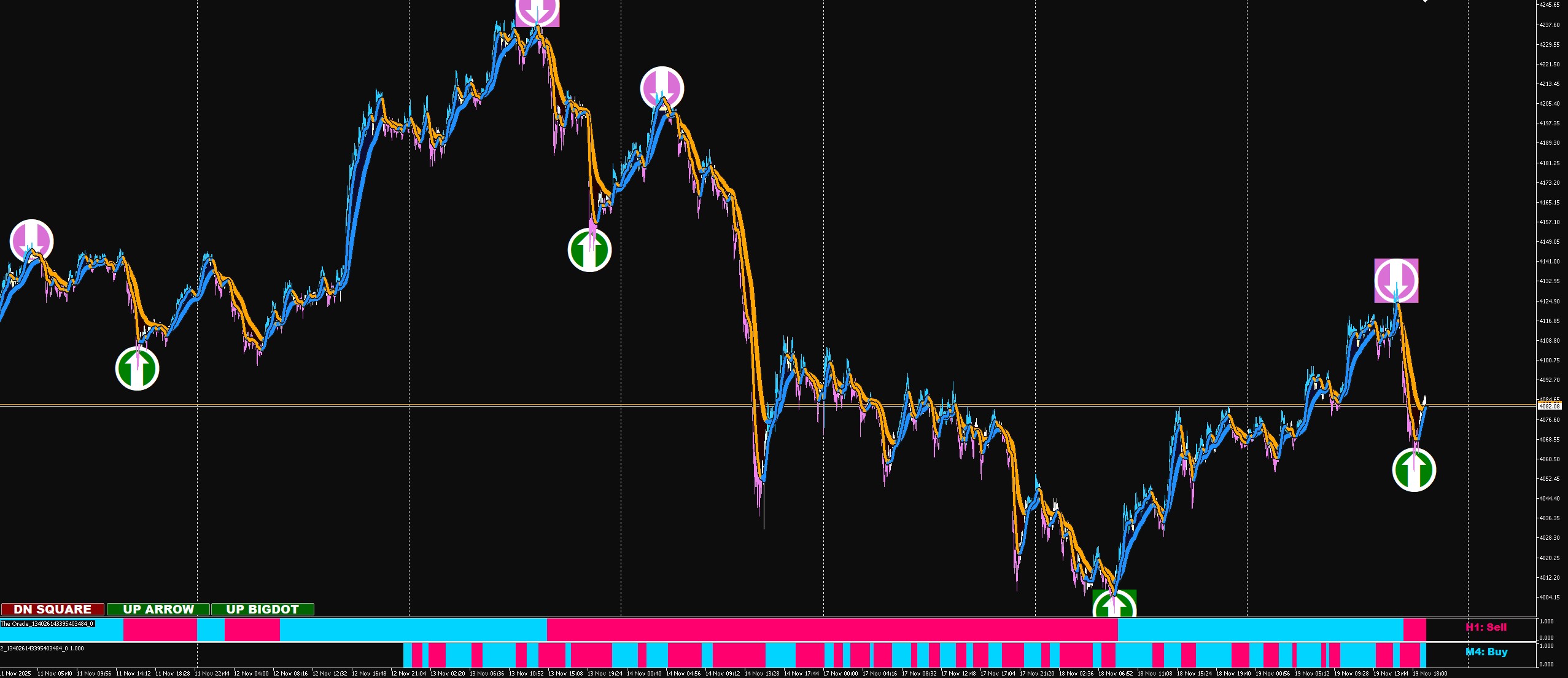 For example when u have arrow on 4 min down u check 1 h oracle if it's red and then 4 m oracle if it's red an enter a trade and u trade in this direction all the time until u see opposite arrow (that's a warning) and if 1 h oracle changes to blue + sema up + 4 m up u trade in the other direction .