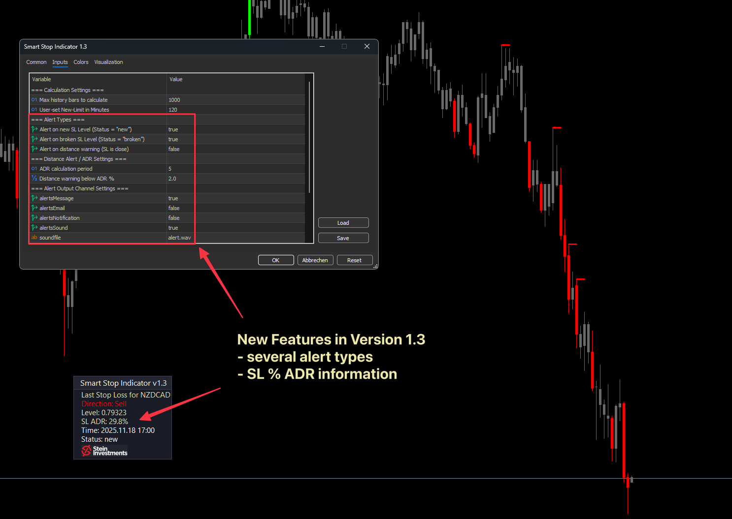 Version 1.3 now delivers precise stop-distance context with SL %ADR, improved status handling, and multiple new alert types that notify you instantly when something relevant happens on your chart.