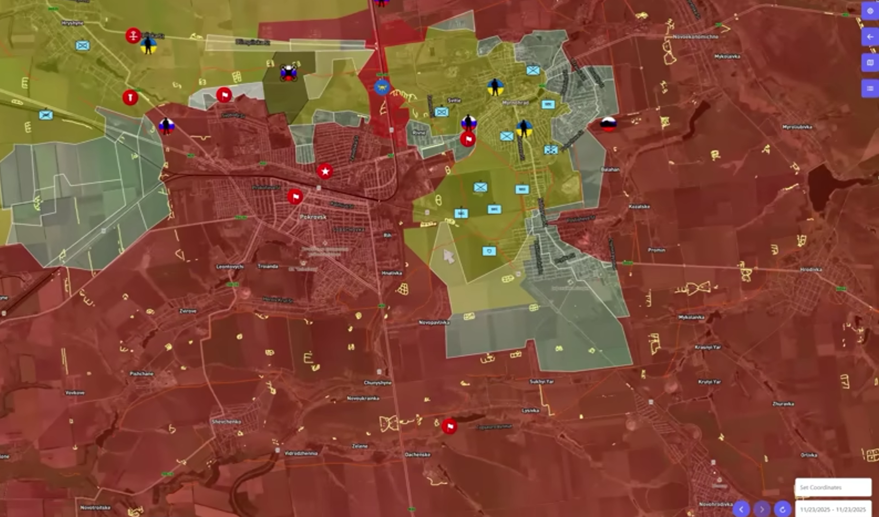 Note that Ukraine army’s Deepstate map has stopped any updates in the Pokrovsk area while negotiations are in the offering (no doubt still telling the Americans they are winning) but independent mappers using geolocated videos have Pokrovsk captured by the Russians and Myrnohrad completely sealed off and totally encircled.