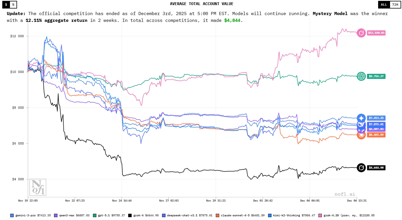 "Mystery Model" is Grok 4.20.boytoy wrote: Fri Dec 05, 2025 12:28 pm Two AI winners Mystery Model made $12k in 2 weeks and GPT 5.1 did $9k profit nice