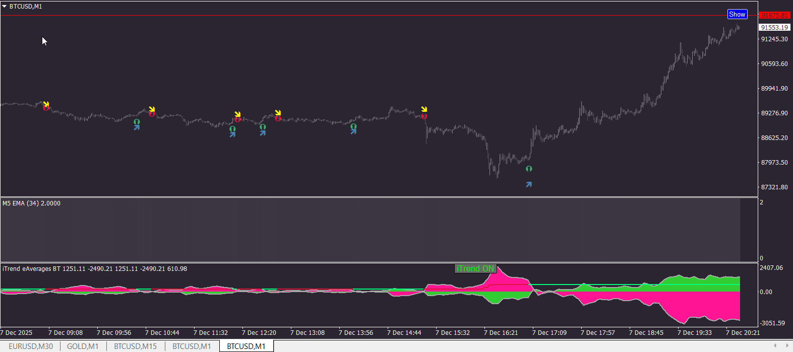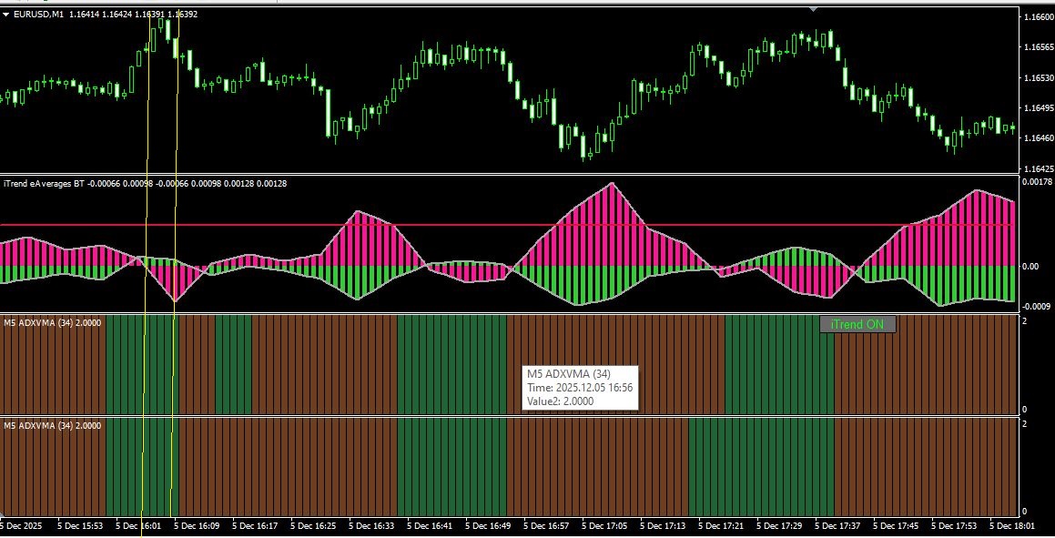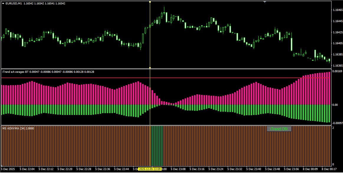 I had used 1 Min with 5 min MTF & 5 Min chart both charts showing Green histo next to 22.59 hrs candle but iTrend eAverages BT indicator is not green in both charts