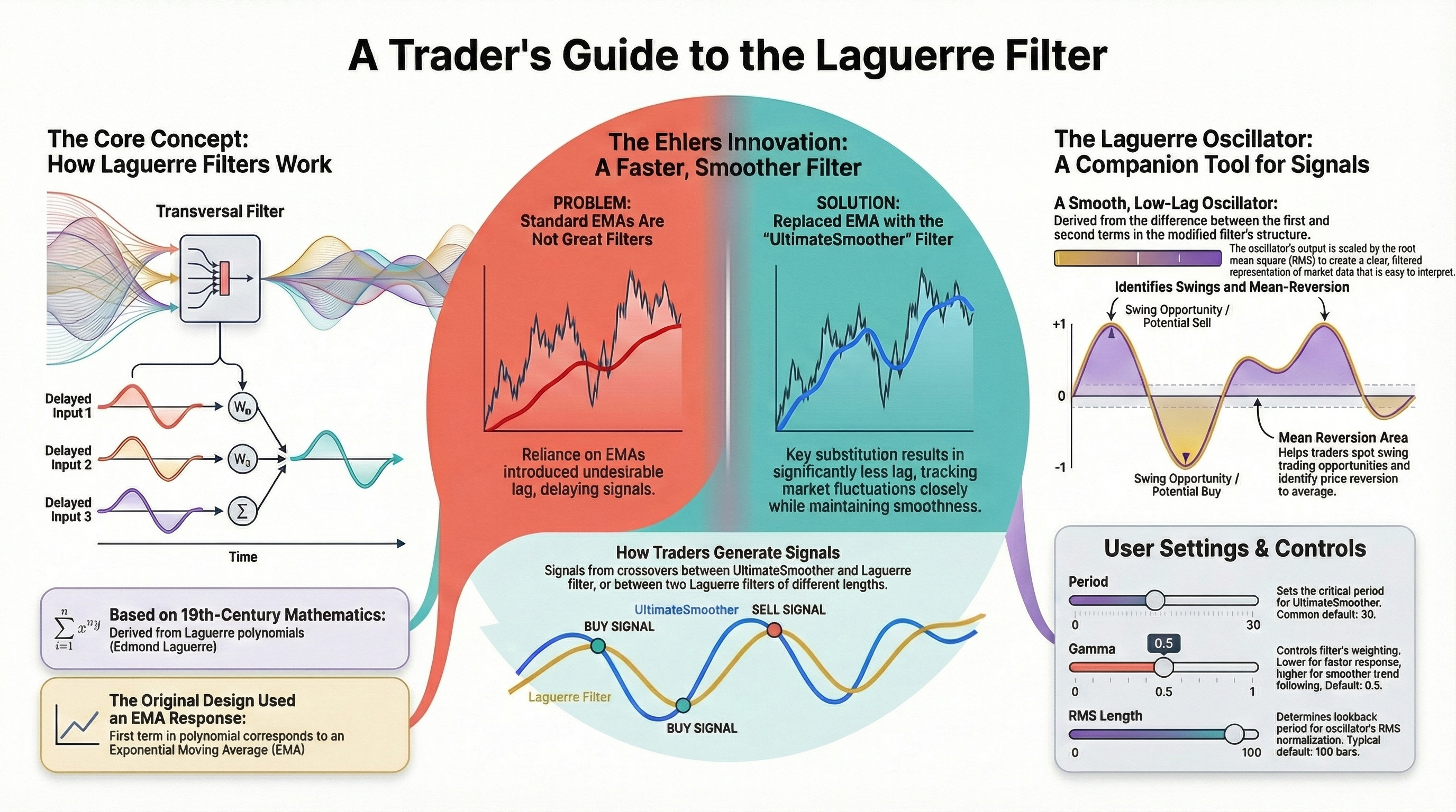 Ehlers observed that these characteristics of Laguerre polynomials make them suitable for use in a transversal filter structure, and thus the Laguerre filter was born. However, he notes that EMAs are not great filters in general. As such, to improve on the Laguerre filter's design, Ehlers modified it by replacing the EMA term with his UltimateSmoother filter. The resulting Laguerre filter has significantly reduced lag, achieving a tighter response to market fluctuations while maintaining smoothness. Ehlers suggests that traders can analyze crossings between the UltimateSmoother and this Laguerre filter, or those between two Laguerre filters of different order, for helpful buy and sell signals.