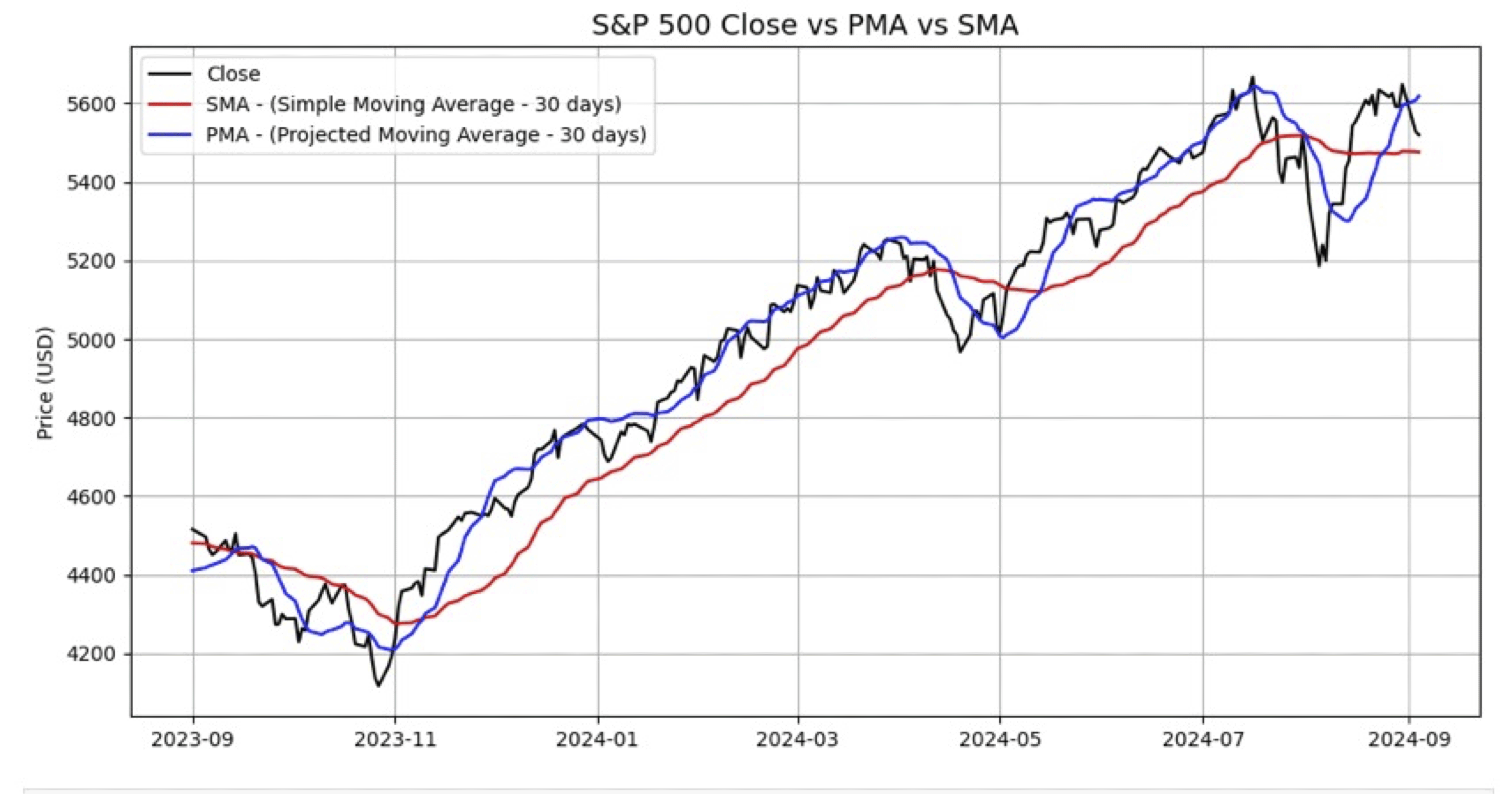 FIGURE 9: PYTHON. This displays an example of a 30-day PMA on a daily chart of the S&P 500 index along with a 30-day simple moving average (SMA) for comparison. The projected moving average, introduced by John Ehlers in his article in this issue, was coded here using the Python language and then plotted using Matplotlib.