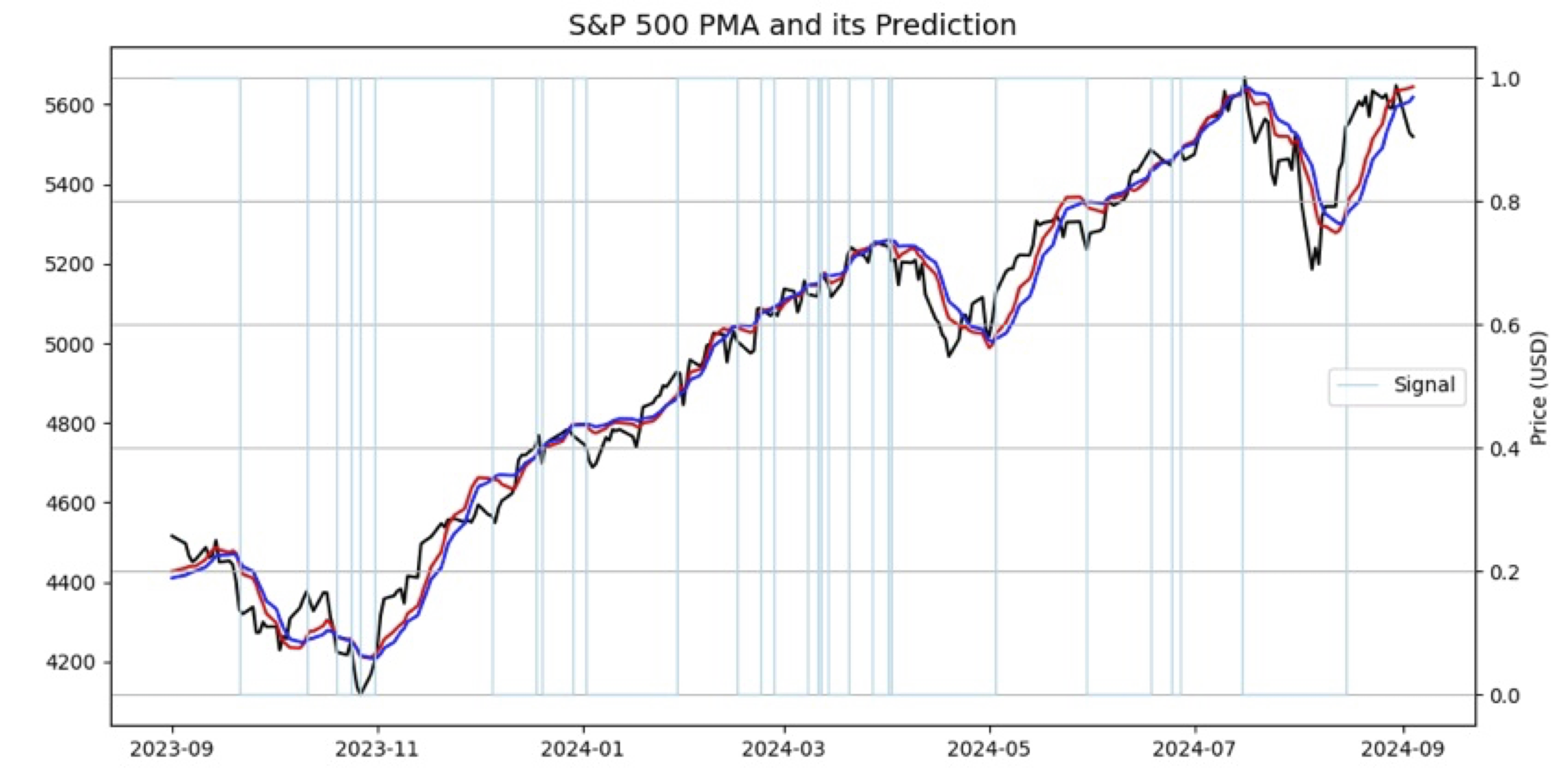 FIGURE 10: PYTHON. Here, the PMA and PMA prediction indicators are plotted on S&P 500 index daily data downloaded from Yahoo Finance. The vertical light-blue lines highlight the PMA and PMA prediction indicator crossovers.