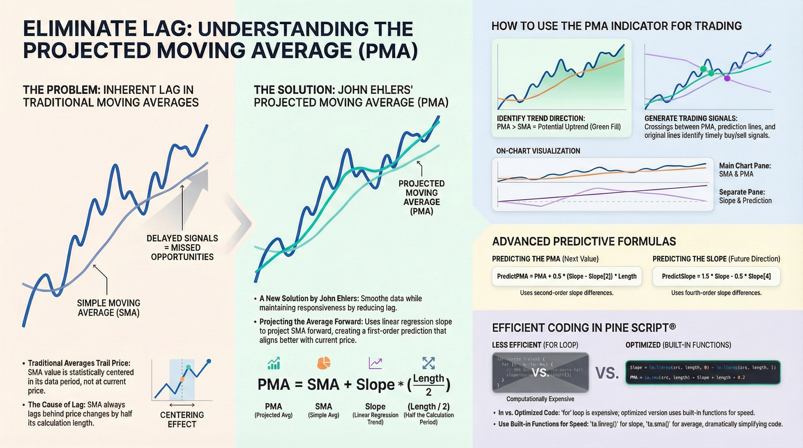 In “Removing Moving Average Lag” in this issue, John Ehlers introduces his projected moving average (PMA), designed to remove the lag inherent in moving averages. His approach involves adding the slope times half the length of the average to the average itself to accomplish the projected moving average. The code listings given in Ehlers’ article cover the projected moving average as a function; the projected moving average indicator (and its prediction) to plot on a chart; and slope and its prediction, which in this case is an output from the PMA function code and is used to create an oscillator.