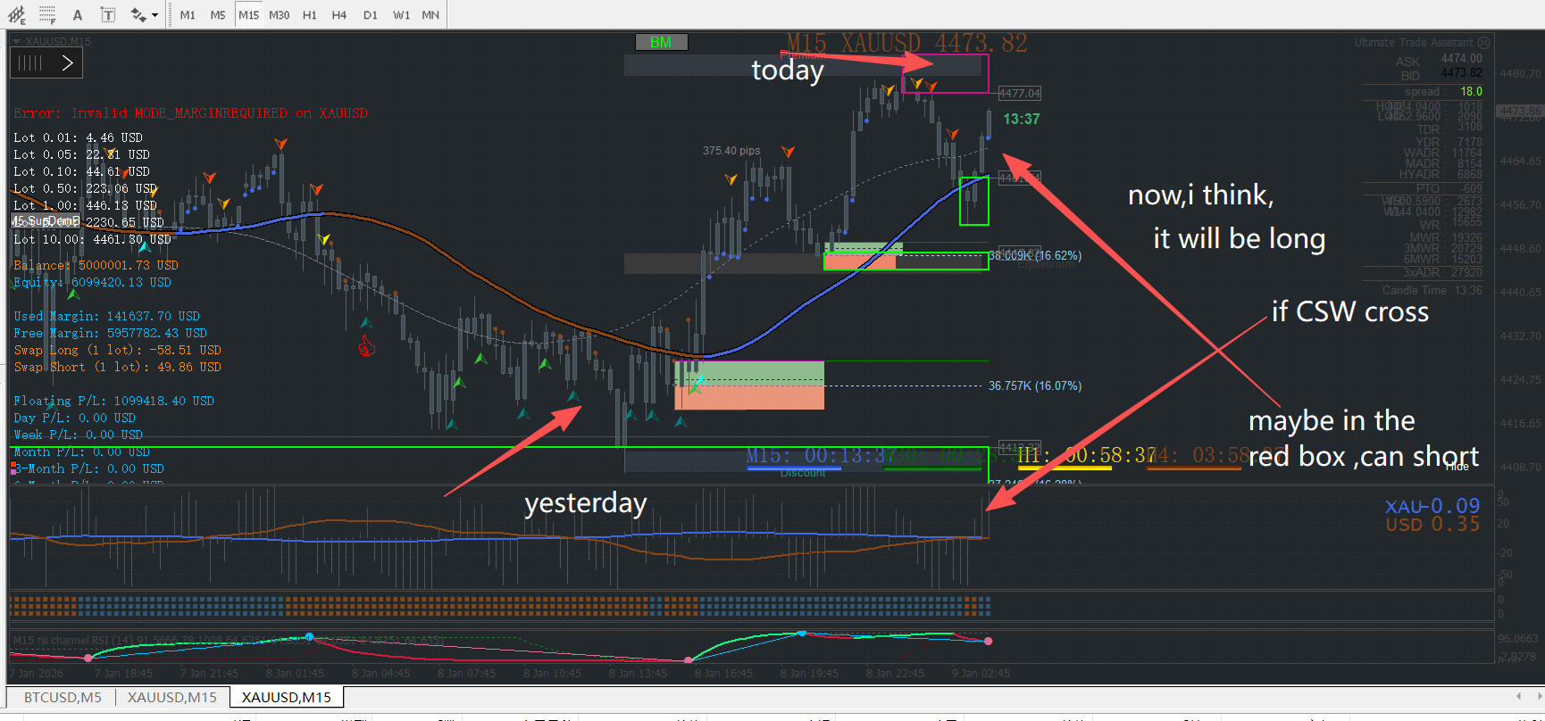My understanding is as follows: After CSW shows an imminent crossover, if "tma+ema(rsi+ra)" generates arrow signals, and at the same time "SupDem Box button 1.02" displays support or resistance boxes, it seems reasonable to enter trades at this point.