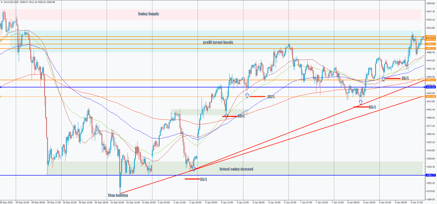 I have tried to illustrate my S/L placement methods on the current M30 spot Gold chart below.