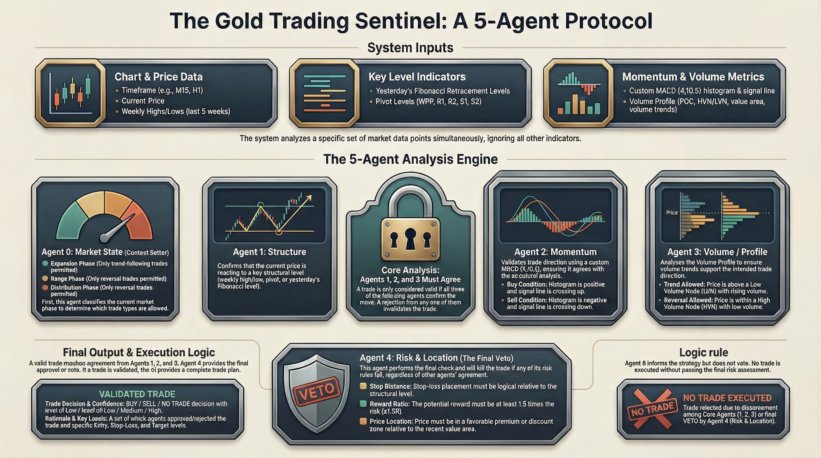 according to the Gold Trading Sentinel v1.03 — 5-agent system.